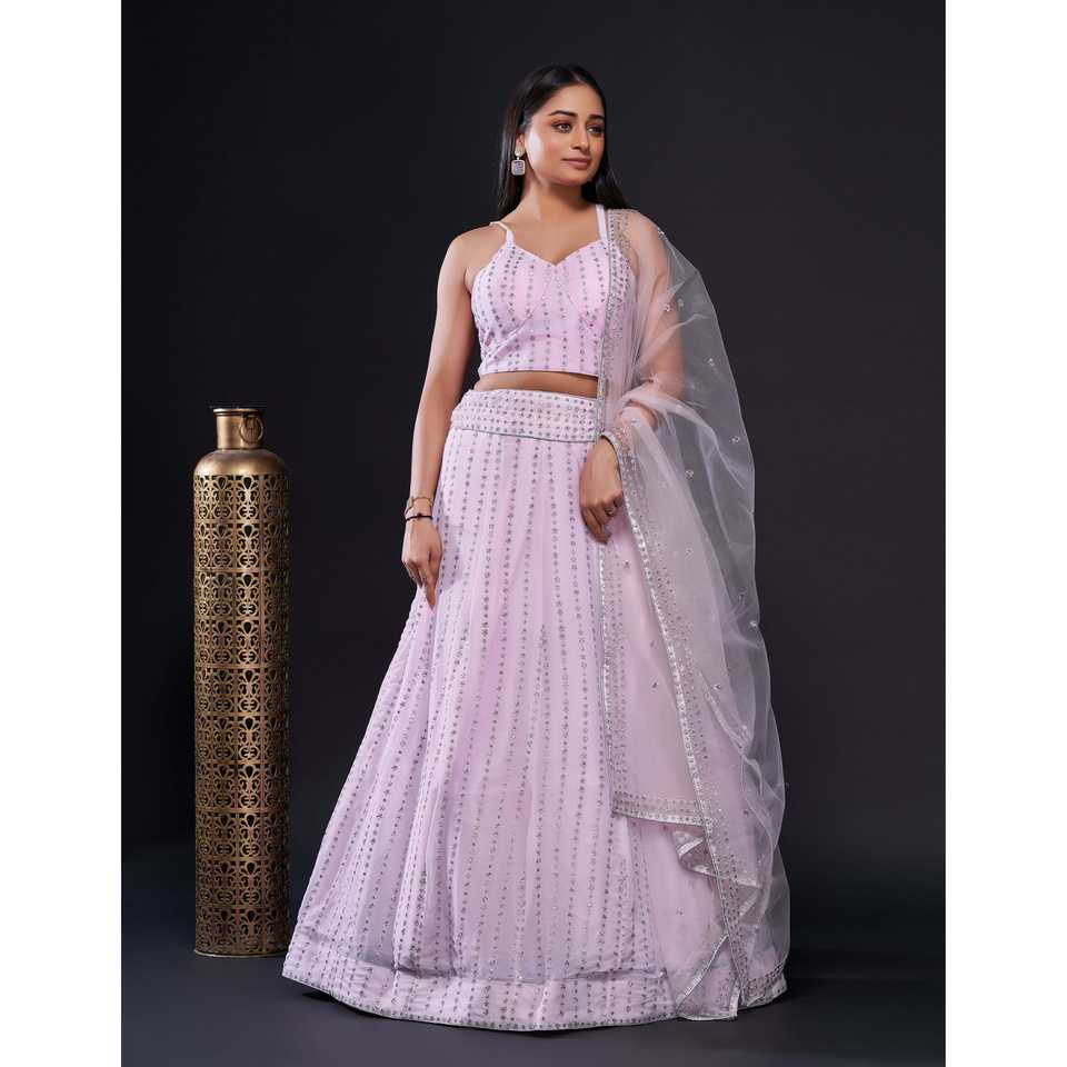ชุดเลเฮนกาโชลีสีชมพูไซส์ M สำหรับงานปาร์ตี้สไตล์อินเดียและปากีสถาน ตกแต่งด้วยงานปักเลื่อมและลายปักดิ้นทอง ออกแบบโดย FB Designer