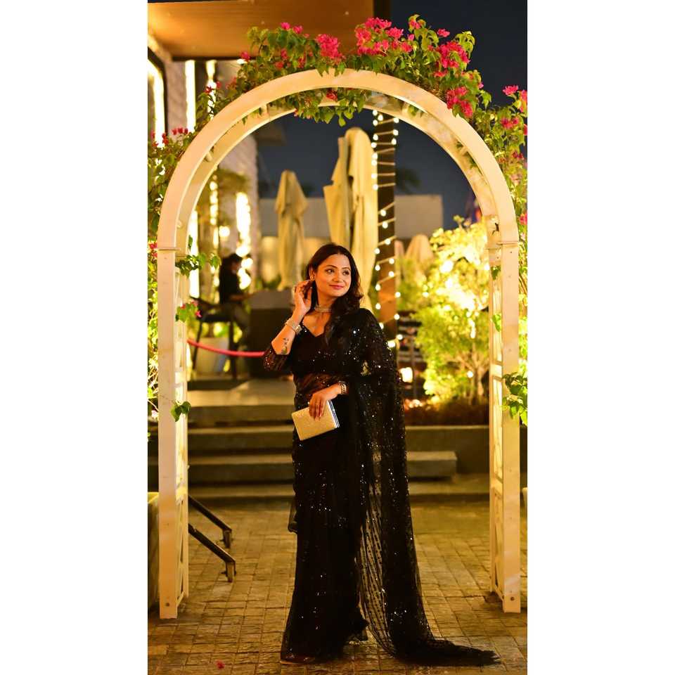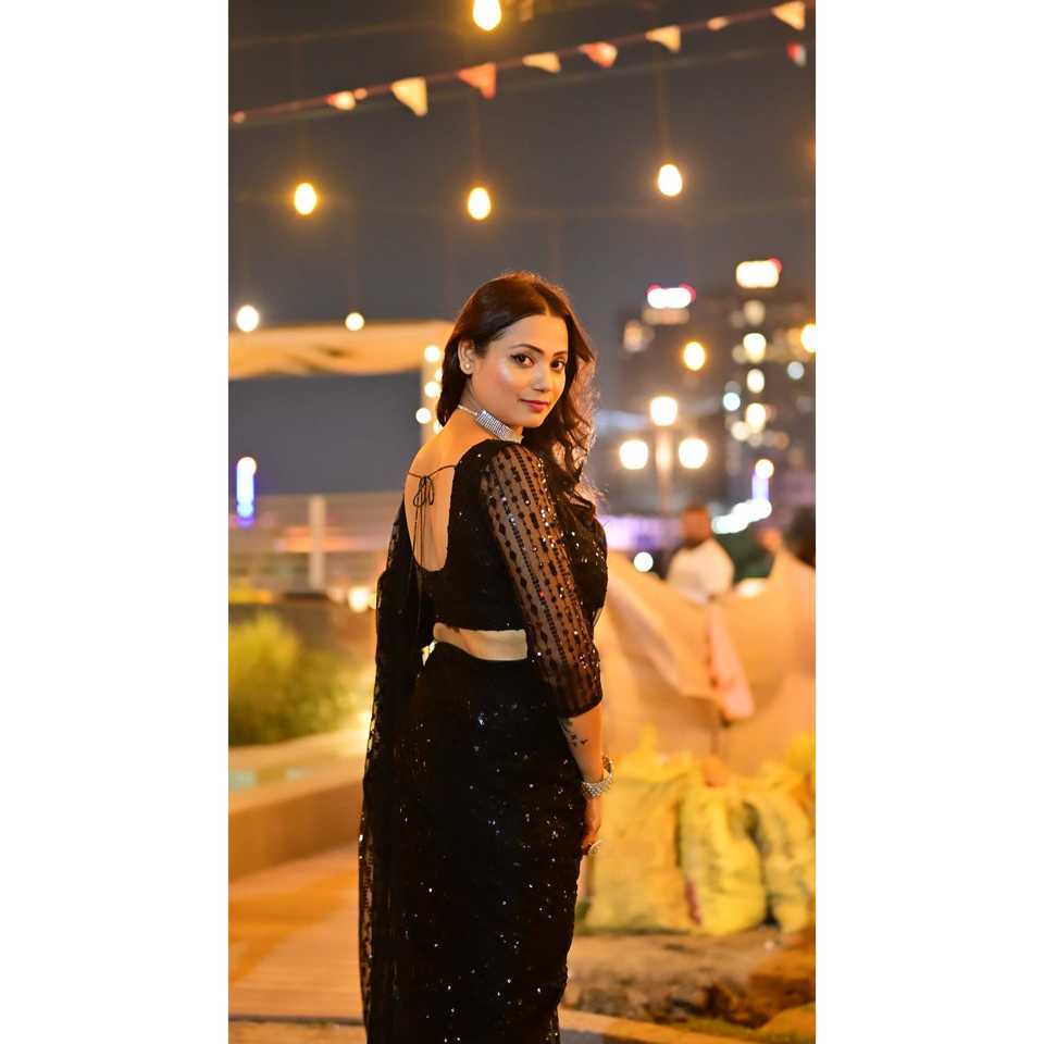ชุดส่าหรีงานปาร์ตี้สีดำสำหรับผู้หญิง ดีไซน์ FB ประดับด้วยเลื่อมและงานปักดิ้น สวยสง่างาม ไซส์ M น้ำหนัก 950 กรัม