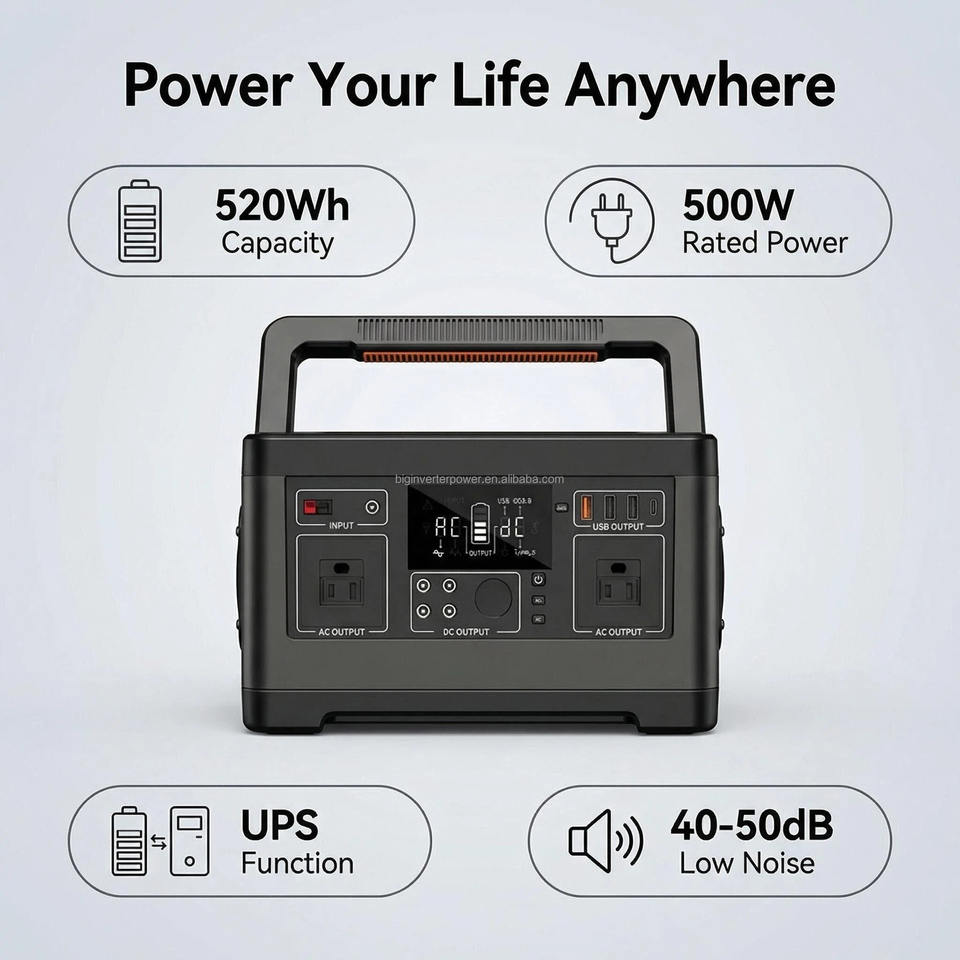 สถานีไฟฟ้าพกพา 500W 520Wh ได้รับการรับรองจาก FCC 110V สำหรับรถบ้านในสหรัฐฯ แคมป์ปิ้ง ปาร์ตี้ท้ายรถ โอเวอร์แลนด์ ใช้งานนอกกริด และสำรองไฟ
