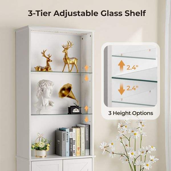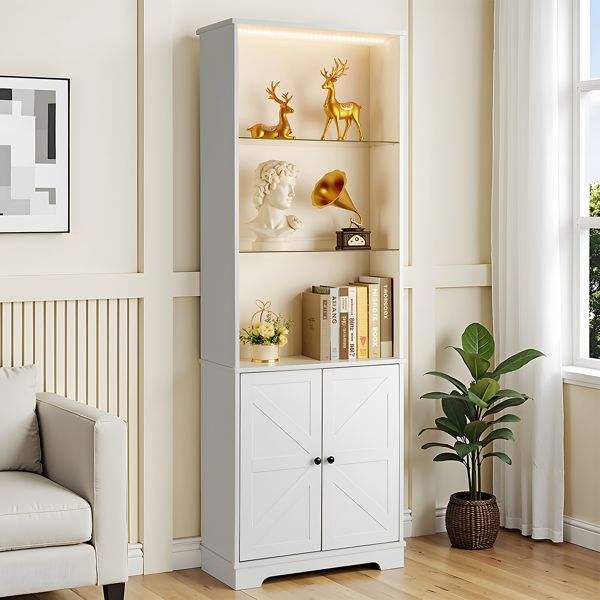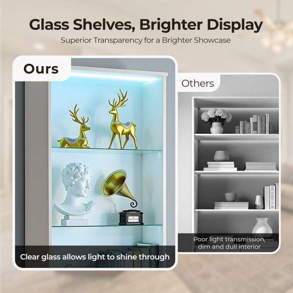 FCH White 60*23.5*180cm Display Cabinet 3-Layer Glass Shelf 2-Door Double Z LED Light Strip Front Curved Base Feet Living Room