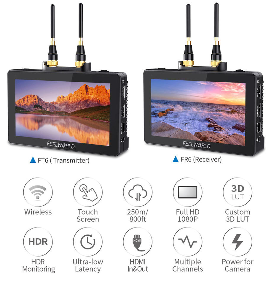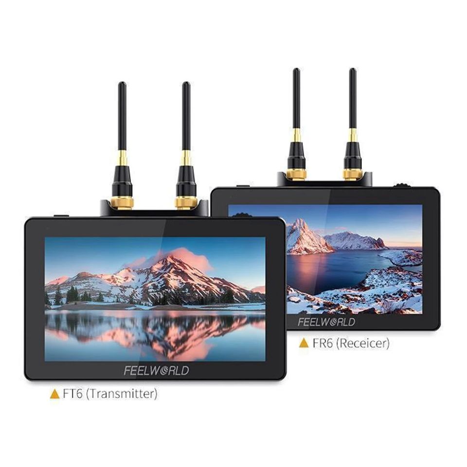 ระบบส่งสัญญาณวิดีโอไร้สาย FEELWORLD FT6 FR6 ขนาด 5.5 นิ้ว พร้อมตัวส่งและตัวรับสัญญาณ สำหรับกล้อง DSLR จอภาพแบบสัมผัสในสนาม