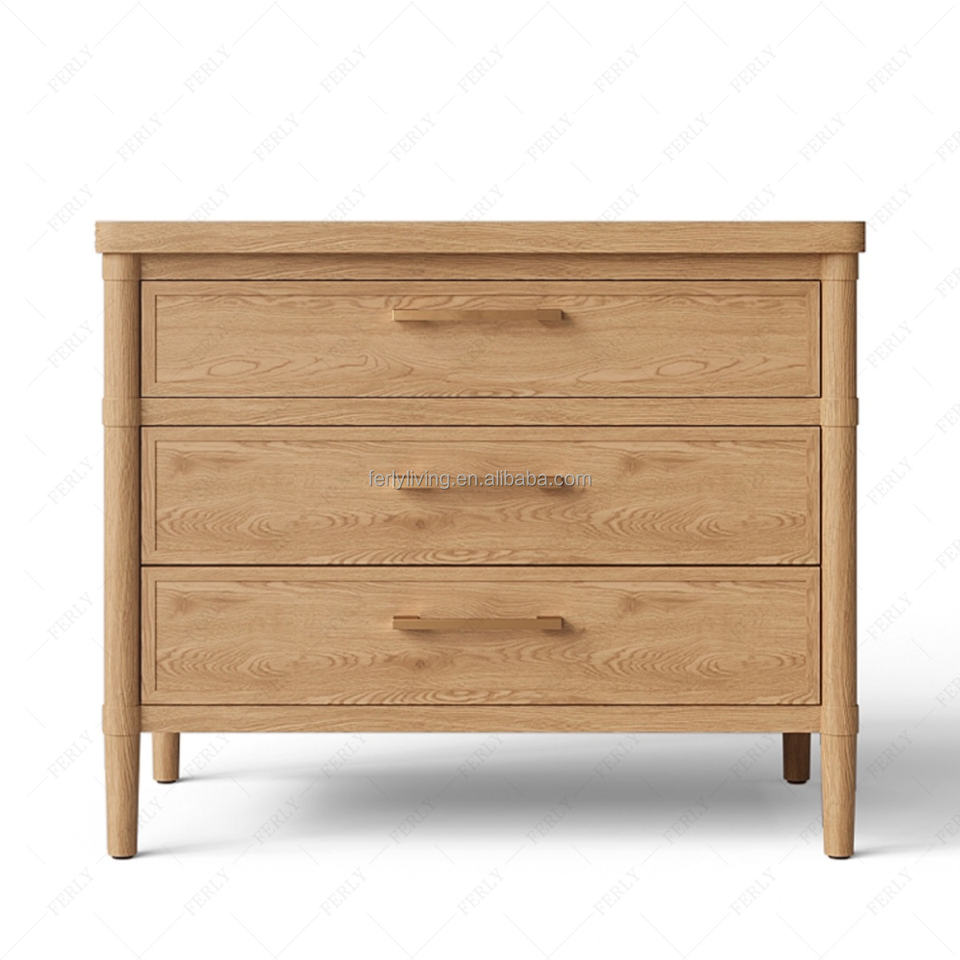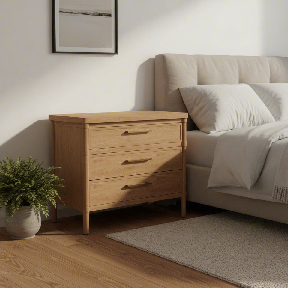 เฟอร์ลี่ โต๊ะข้างเตียงไม้โอ๊คสไตล์โมเดิร์นมินิมอล งานแฮนด์เมด 3 ลิ้นชัก ประกอบสำเร็จ เป็นมิตรกับสิ่งแวดล้อม ทนทาน เหมาะสำหรับห้องนอน