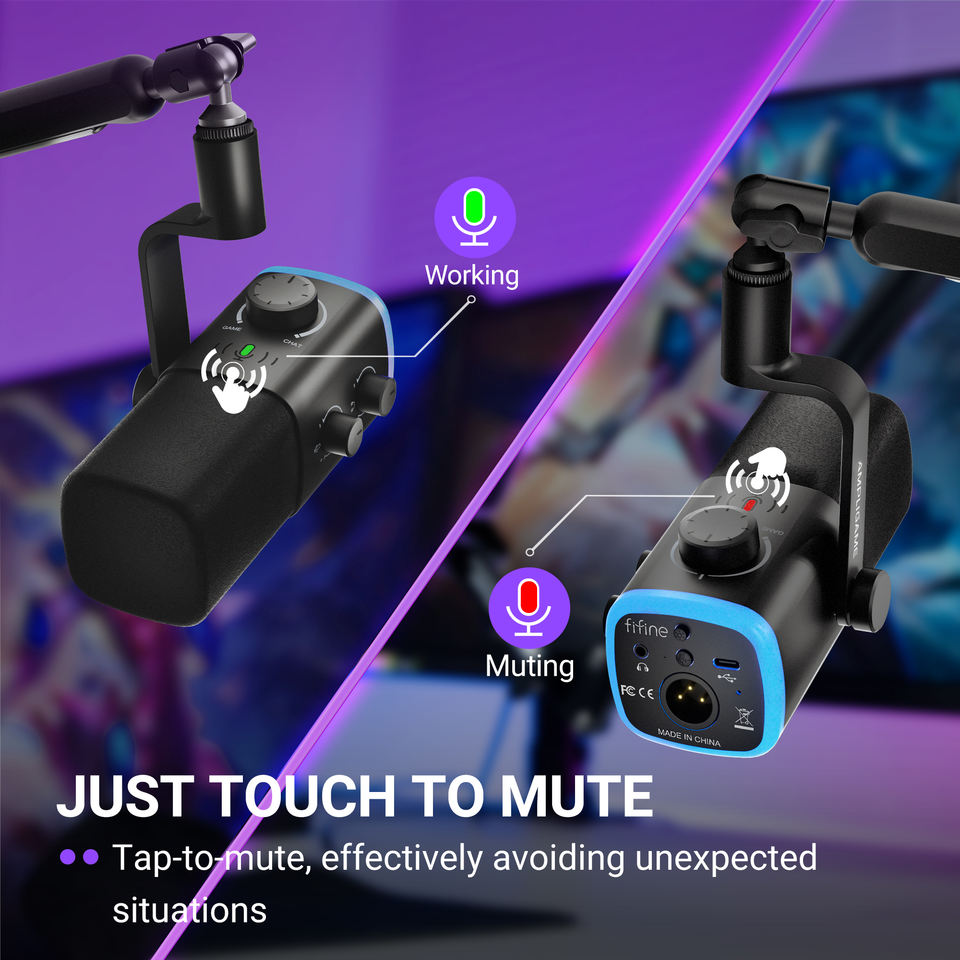 ไมโครโฟนไดนามิก FIFINE AM9 XLR/USB ไฟ RGB ตัดเสียงรบกวน (ANC) ปุ่มปรับระดับเสียง/เกน แบบพกพา ไมค์สำหรับเล่นเกมบนพีซีแบบมีสาย