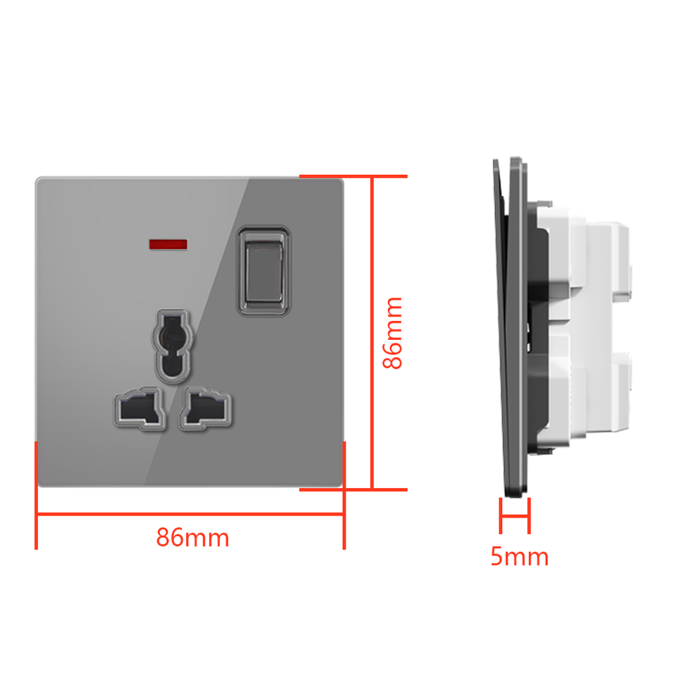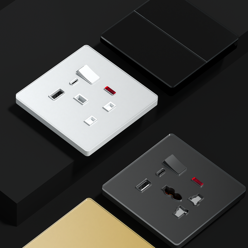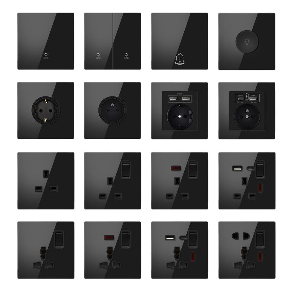 สวิตช์และเต้ารับติดผนังแบบบางพิเศษ FIKO พร้อมพอร์ต USB Type-C แผงกระจกนิรภัยสีดำ มาตรฐานสหราชอาณาจักร เหมาะสำหรับบ้าน/โรงแรม
