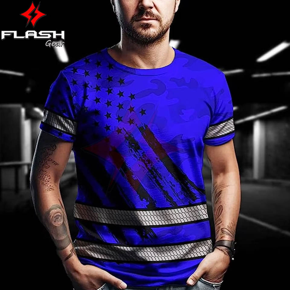 แฟลชเกียร์แอนซี่คลาส1 EN ISO 20471คลาส1กันน้ำเสื้อครอปท็อปลายพรางพิมพ์ซับลิเมชันเพื่อความปลอดภัยเสื้อยืดสะท้อนแสง