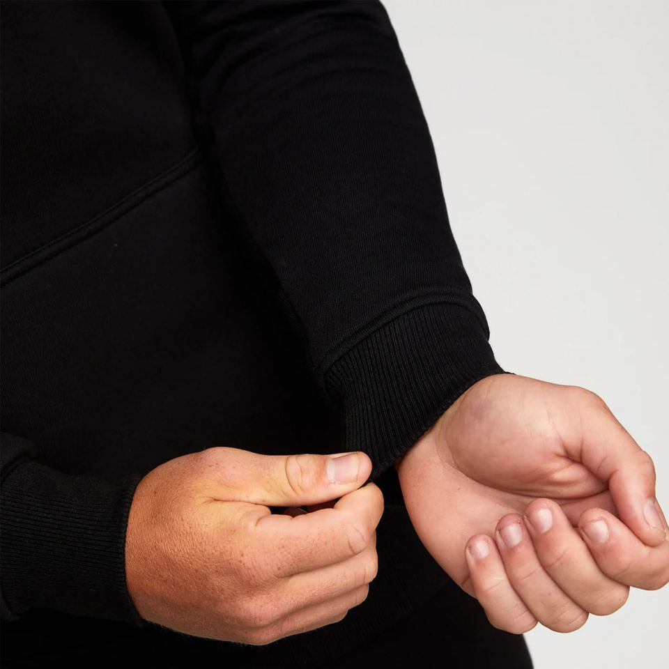 เสื้อฮู้ดสวมหัวขนแกะสีดำมีฮู้ดแบบสวมหัวสำหรับผู้ชายซับในขนแกะทรงสลิมฟิตแขนเสื้อมีเชือกผูกแบบมีฮู้ดปักโลโก้กระเป๋าด้านหน้า