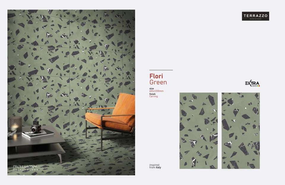 กระเบื้องพอร์ซเลนเคลือบเงาลายเทอร์ราซโซ่สีเขียวฟลอริ พร้อมลายแกะสลัก