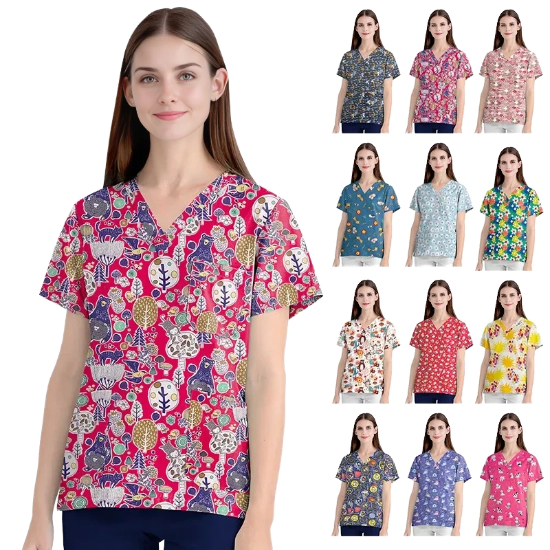 เสื้อยืดคอวีแขนสั้นลายการ์ตูน FMF ผ้าทวิลล์ สำหรับแพทย์ ใช้ในโรงพยาบาล เหมาะสำหรับทั้งชายและหญิง พร้อมชุดผ่าตัดแบบมีเข็มตรวจจับ