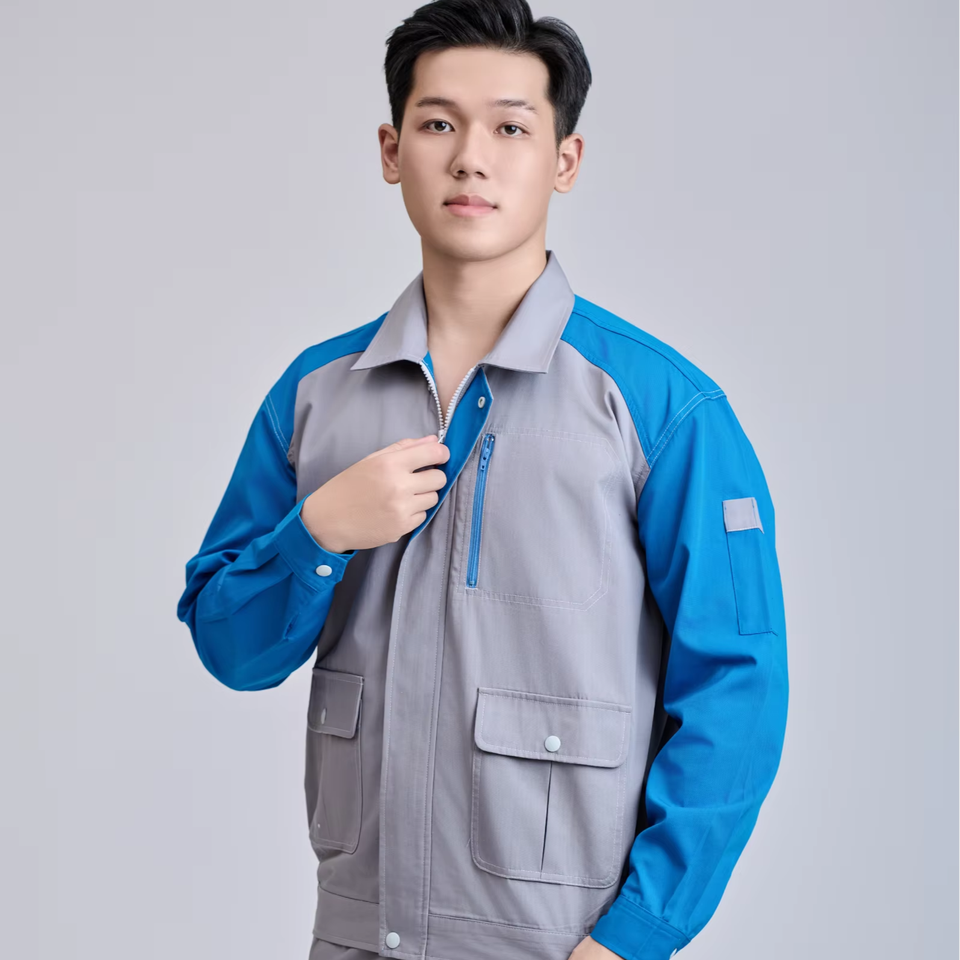 ชุดทำงานแขนยาวสีฟ้าและสีเทาแบบมองเห็นได้ชัดเจนสำหรับผู้ชาย FMF | ผ้า TC ระบายอากาศได้ดี ป้องกันรอยยับ ทนทาน