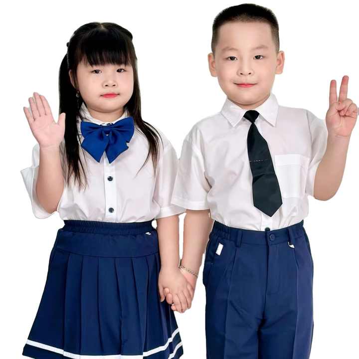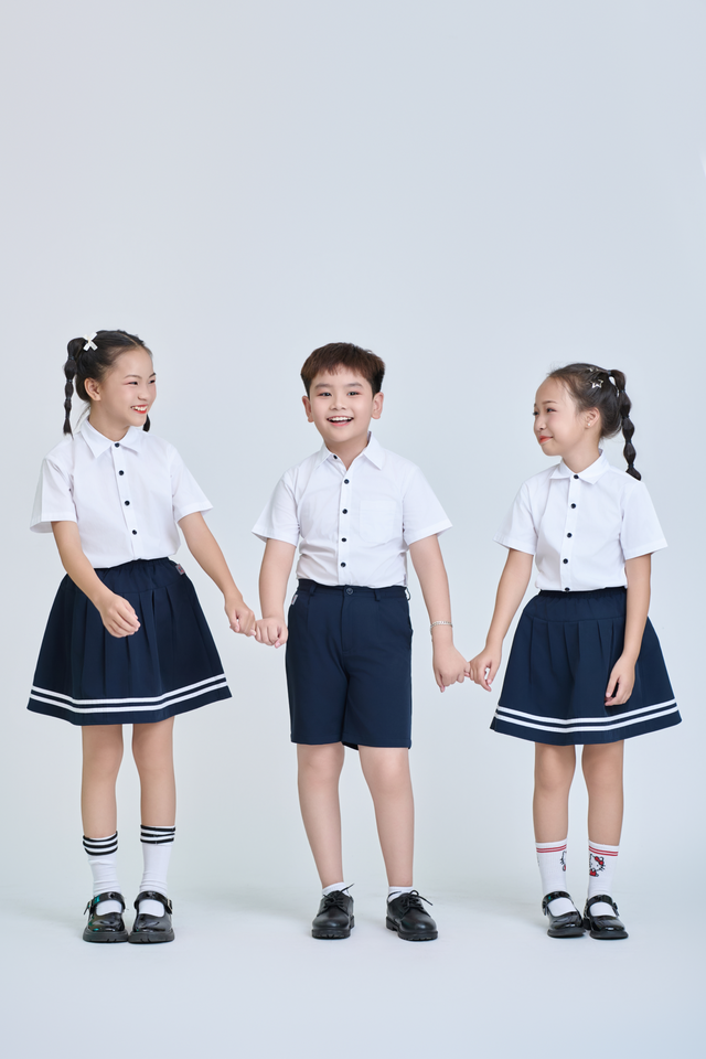 FMF Vietnam 65% Polyester 35% Cotton TC Fabric Unisex Primary School Uniform Shirt for Children White Navy Button