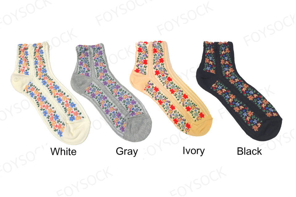 FOYSOCK KOREA Custom Boho floral logo Embroidered Ankle Crew OEM Design Cotton Custom knit ethnic Quality Women's Sports Socks