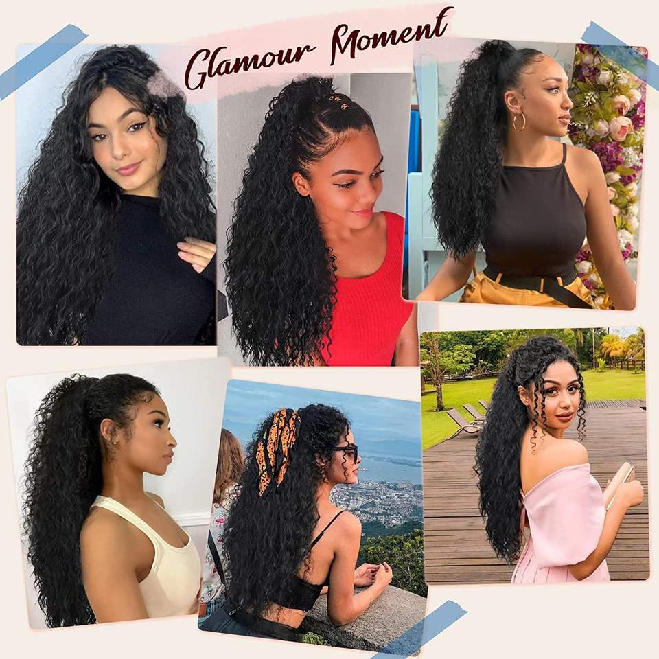 Fujia ผมหางม้าแบบผูกเป็นลอนยาวสำหรับผู้หญิง26 #34ผมหางม้าต่อแบบหยิกสีดำ