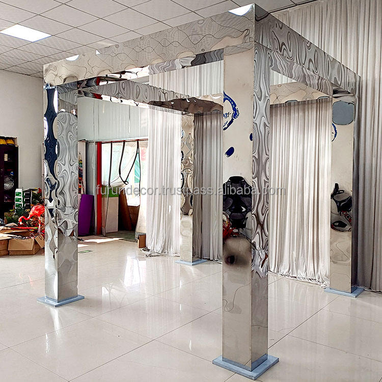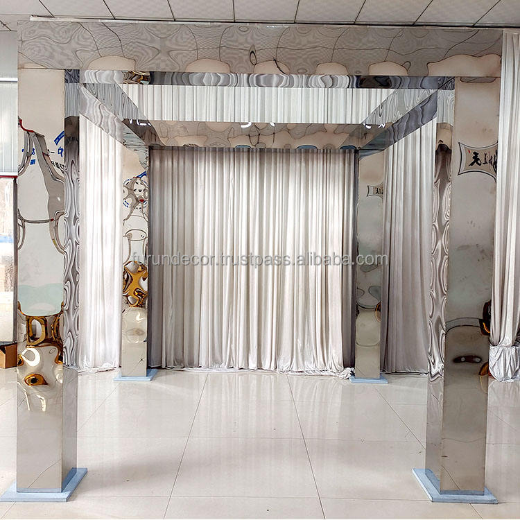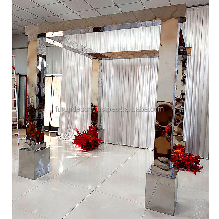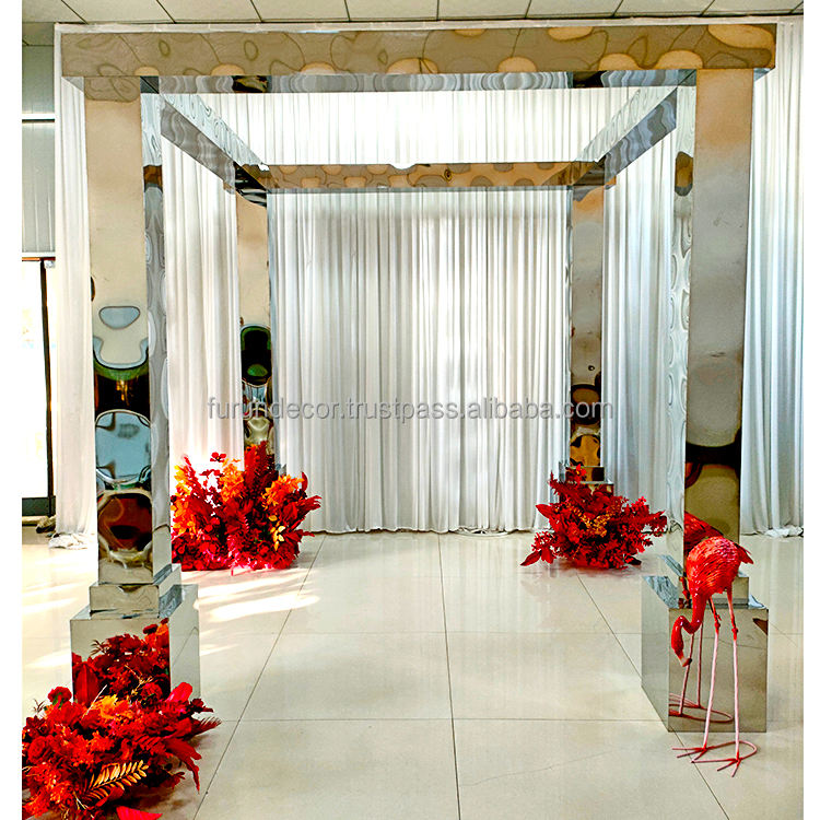 ฉากหลังงานแต่งงานกลางแจ้งทรงสี่เหลี่ยมแบบเรียบง่ายทันสมัย ทำจากสแตนเลสสีเงินแบบกระจก สำหรับงานแต่งงาน