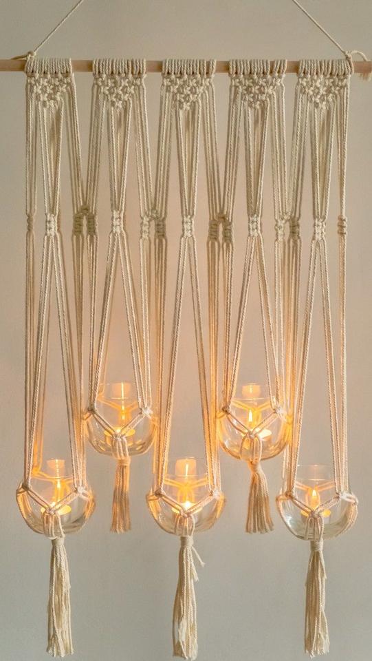 ผ้าทําจากเชิงเทียน Macrame ดีไซน์โบฮีเมียนถักด้วยเชือกฝ้าย 100% โถเทียนบนโต๊ะสําหรับฟ้าผ่า