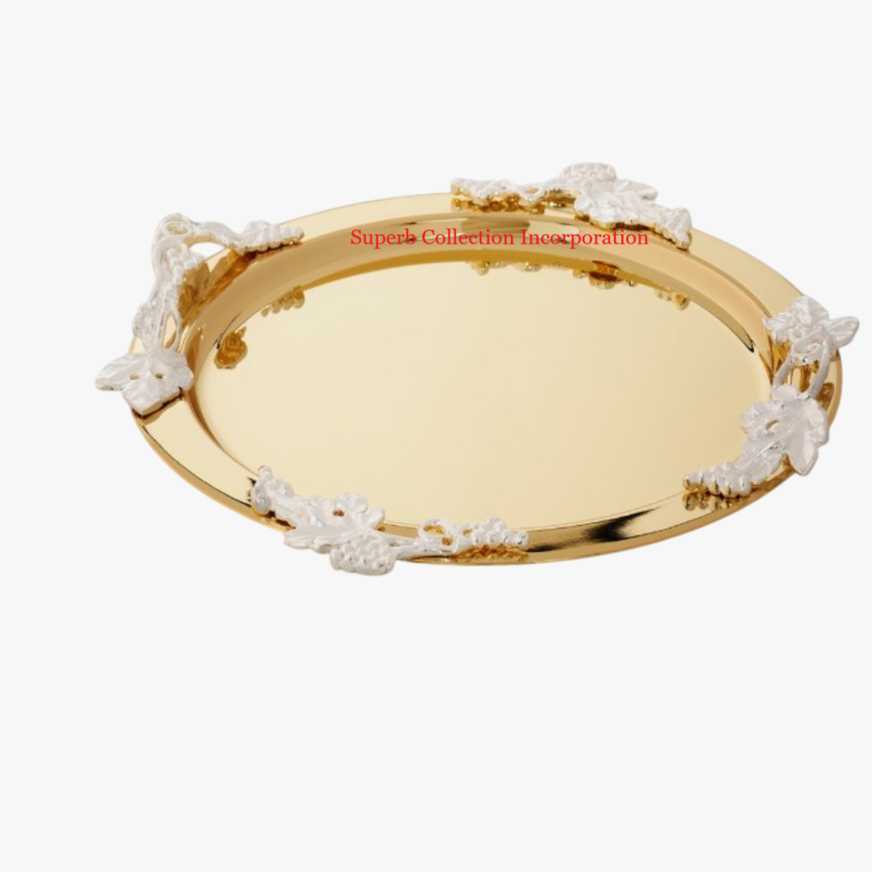 ถาดเสิร์ฟอาหารรูปทรงกลมดีไซน์สุดหรูถาดโลหะสีทองพร้อมลายดอกไม้สำหรับงานปาร์ตี้ในโรงแรม