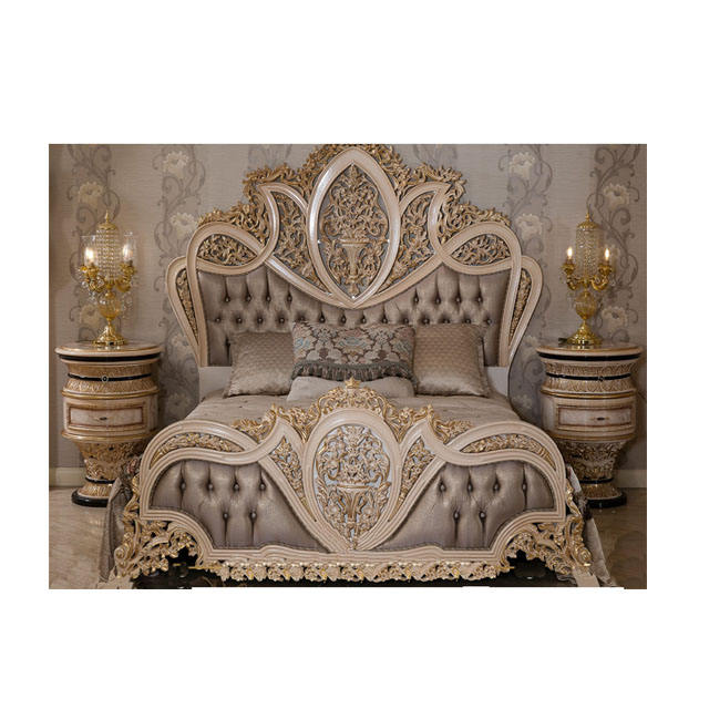 เตียงใบไม้สีทองฝรั่งเศสชั้นเลิศและโต๊ะข้างเตียงมหาราจาไม้สักหรูดีไซน์แบบบาร็อคอิตาลี