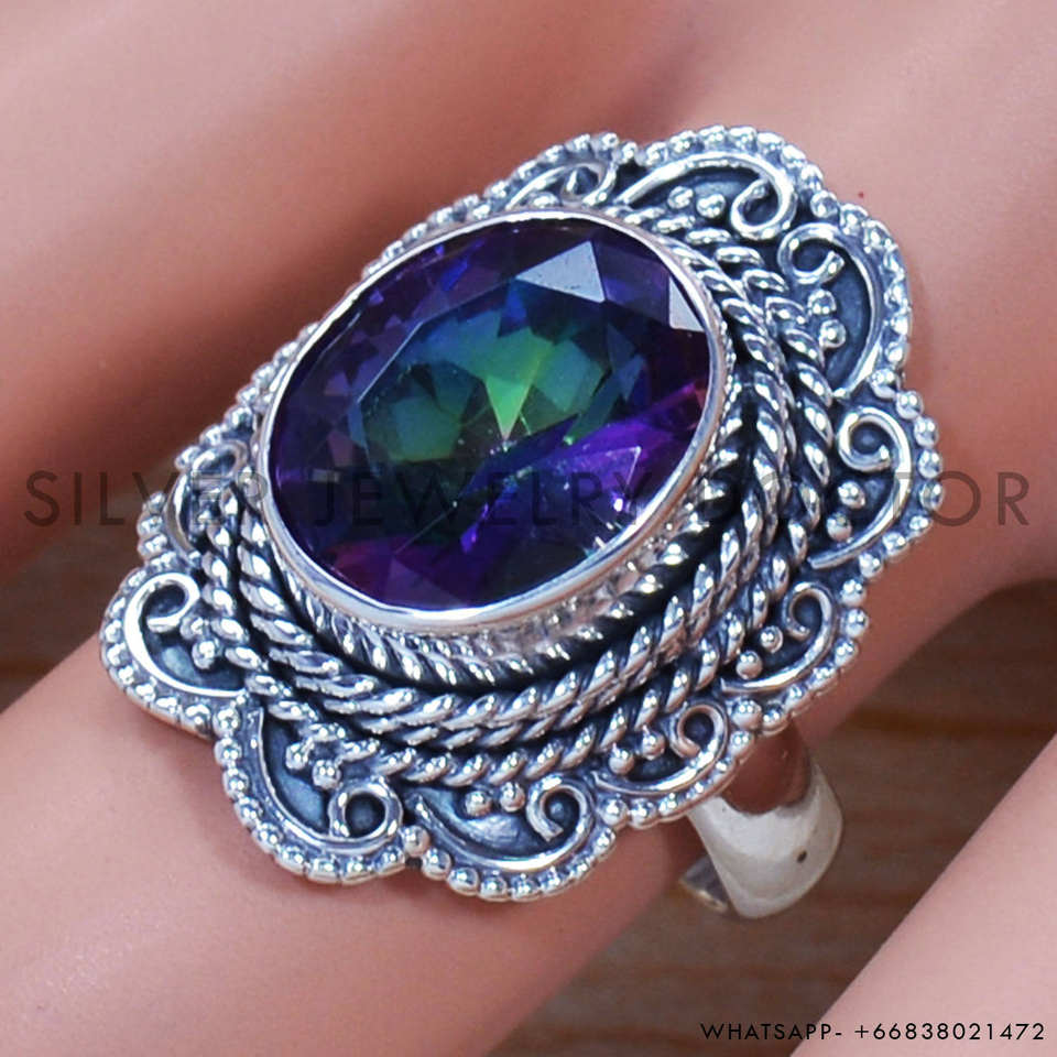 แหวนเงินแท้ 925 ประดับพลอยมิสติกโทแพซทรงเหลี่ยมเจียระไน งานแฮนด์เมด ราคาขายส่ง เครื่องประดับเงิน