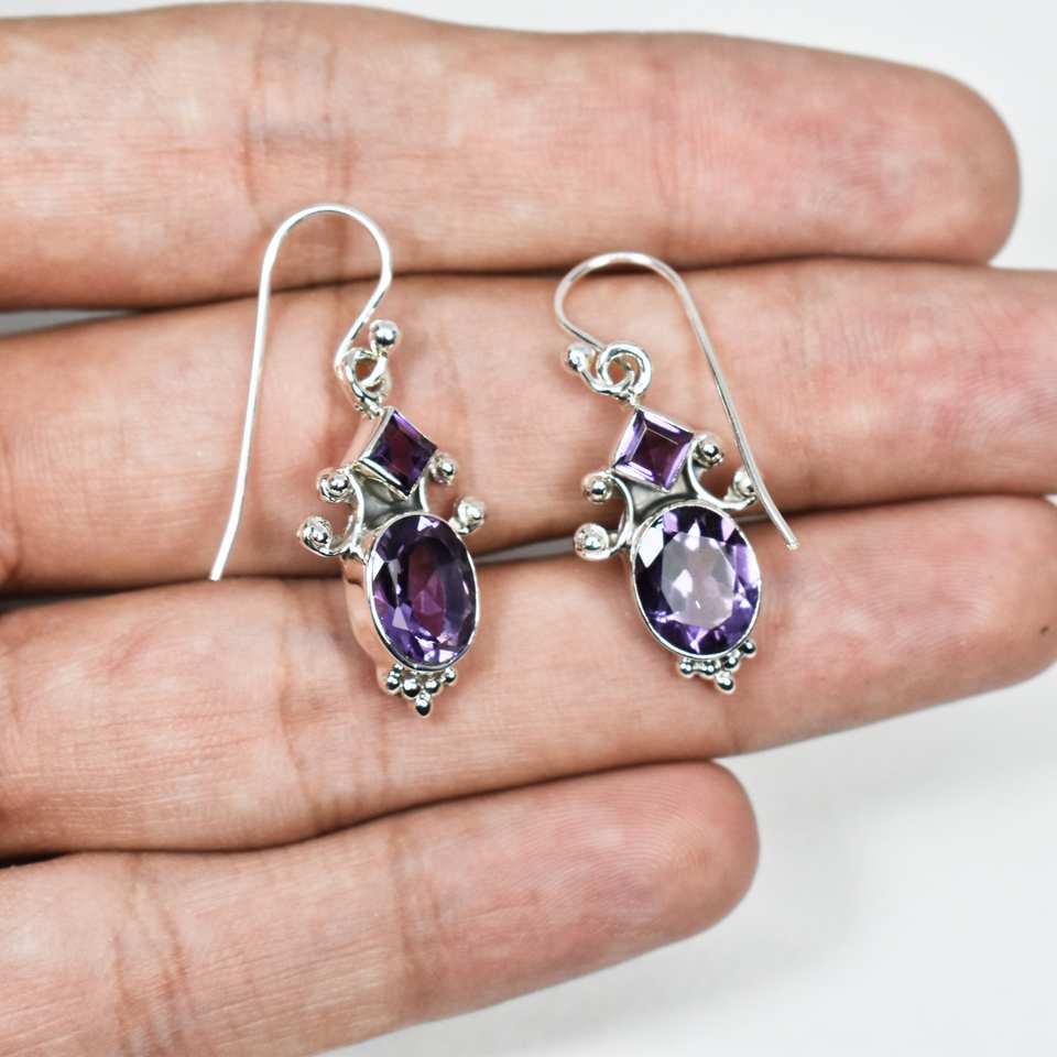 พลอยอเมทิสต์ธรรมชาติเจียระไนแบบเหลี่ยมเพชรพลอย925แบบแข็งต่างหูแบบหยดน้ำเงินสเตอร์ลิงบุคคลที่สามที่ผ่านการรับรองอย่างดี