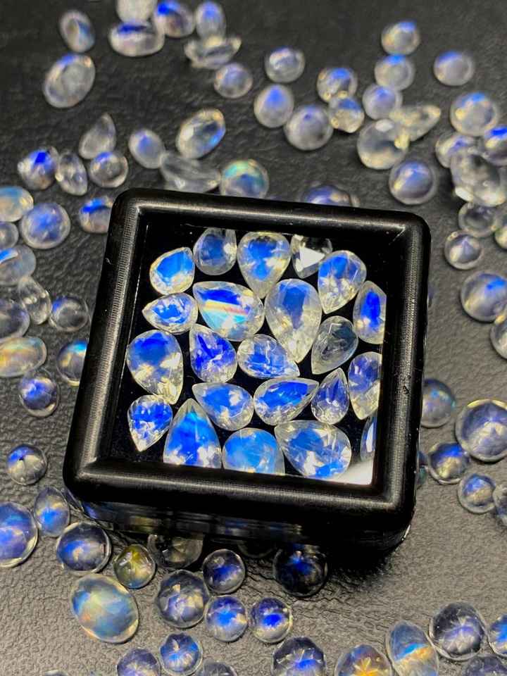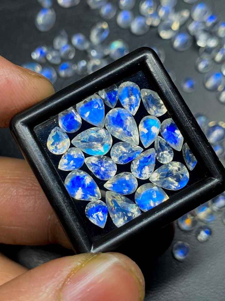 พลอยมูนสโตนสีขาวเหลี่ยมเพชรพลอยรูปหยดน้ำ ประกายสีฟ้า ขนาด 3x5 มม. ถึง 8x10 มม.