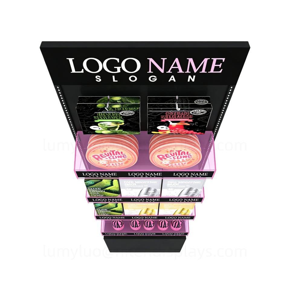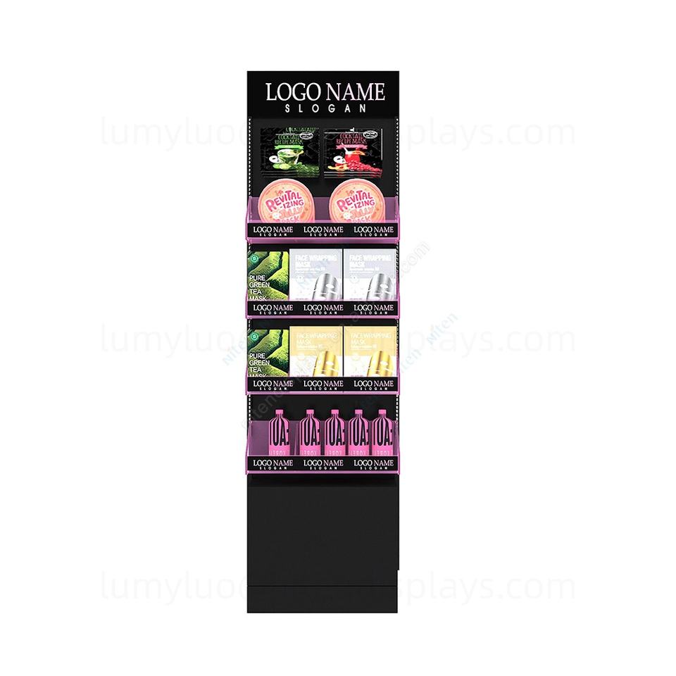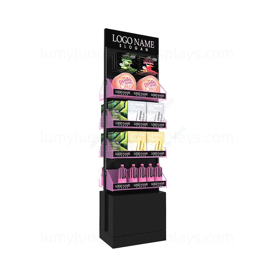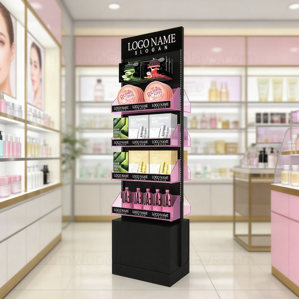 ชั้นวางมาส์กหน้าแบบตั้งพื้น พร้อมชั้นวางอะคริลิคสองด้านและตะขอ ชั้นวางโลหะสำหรับผลิตภัณฑ์ดูแลผิว