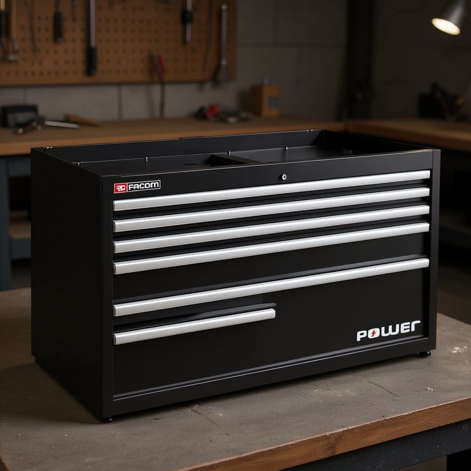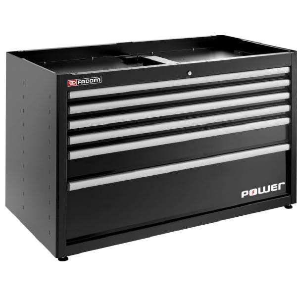 ตู้เก็บของแบบสองชั้น Facom พร้อมลิ้นชัก 6 ช่อง และลิ้นชักใส่ปลั๊กไฟ 1 ช่อง สีดำ - ตู้เก็บเครื่องมือ