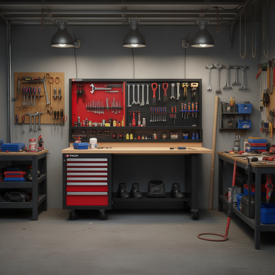 เฟาคอม โต๊ะทำงานเตี้ยพร้อมลิ้นชัก 7 ช่อง ตู้ติดผนัง ท็อปโต๊ะไม้ ตู้เก็บเครื่องมือ