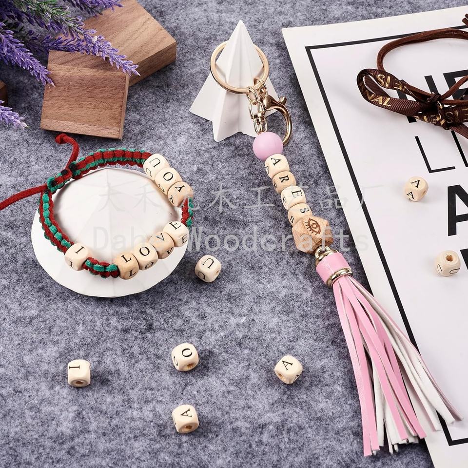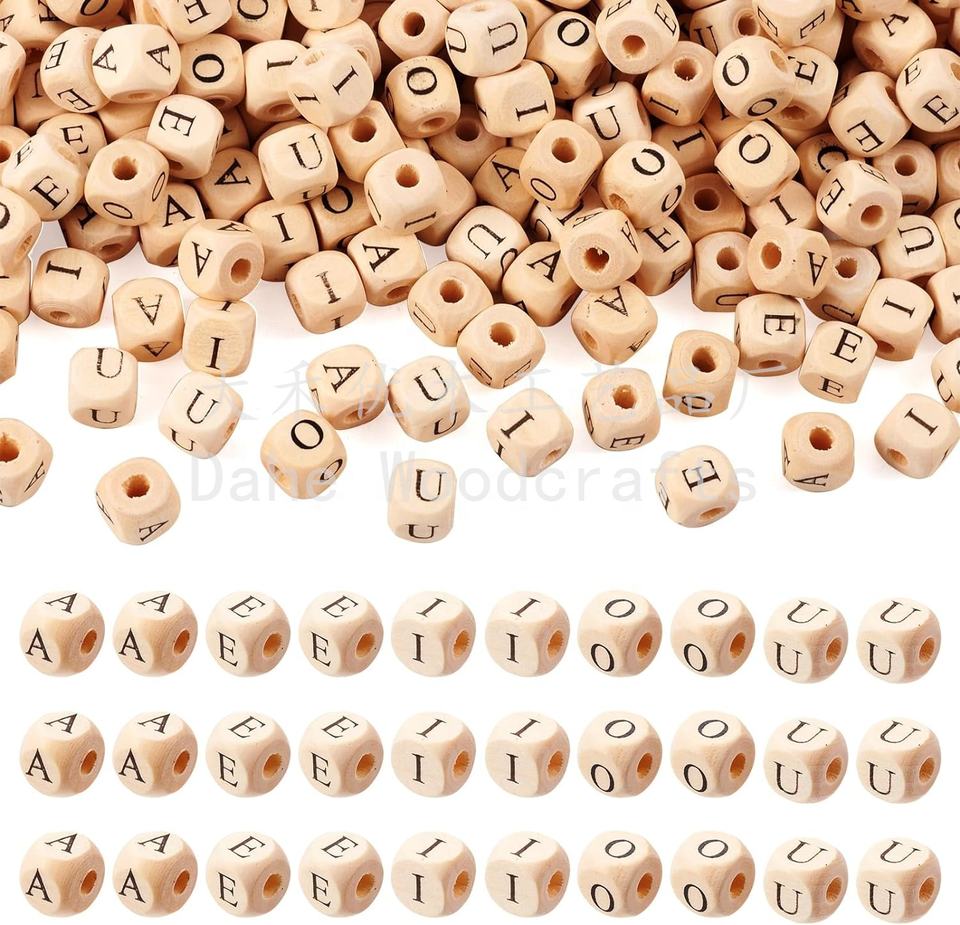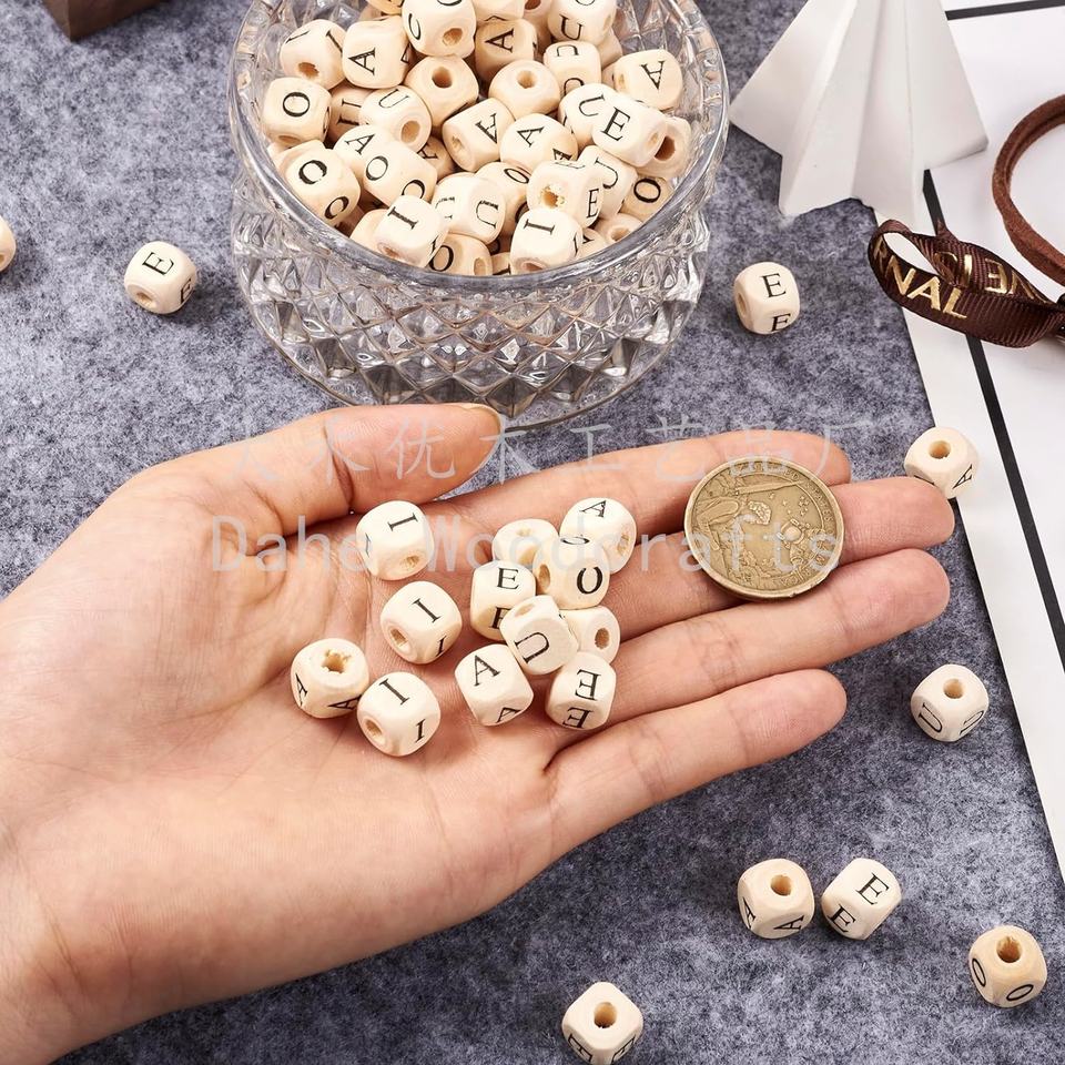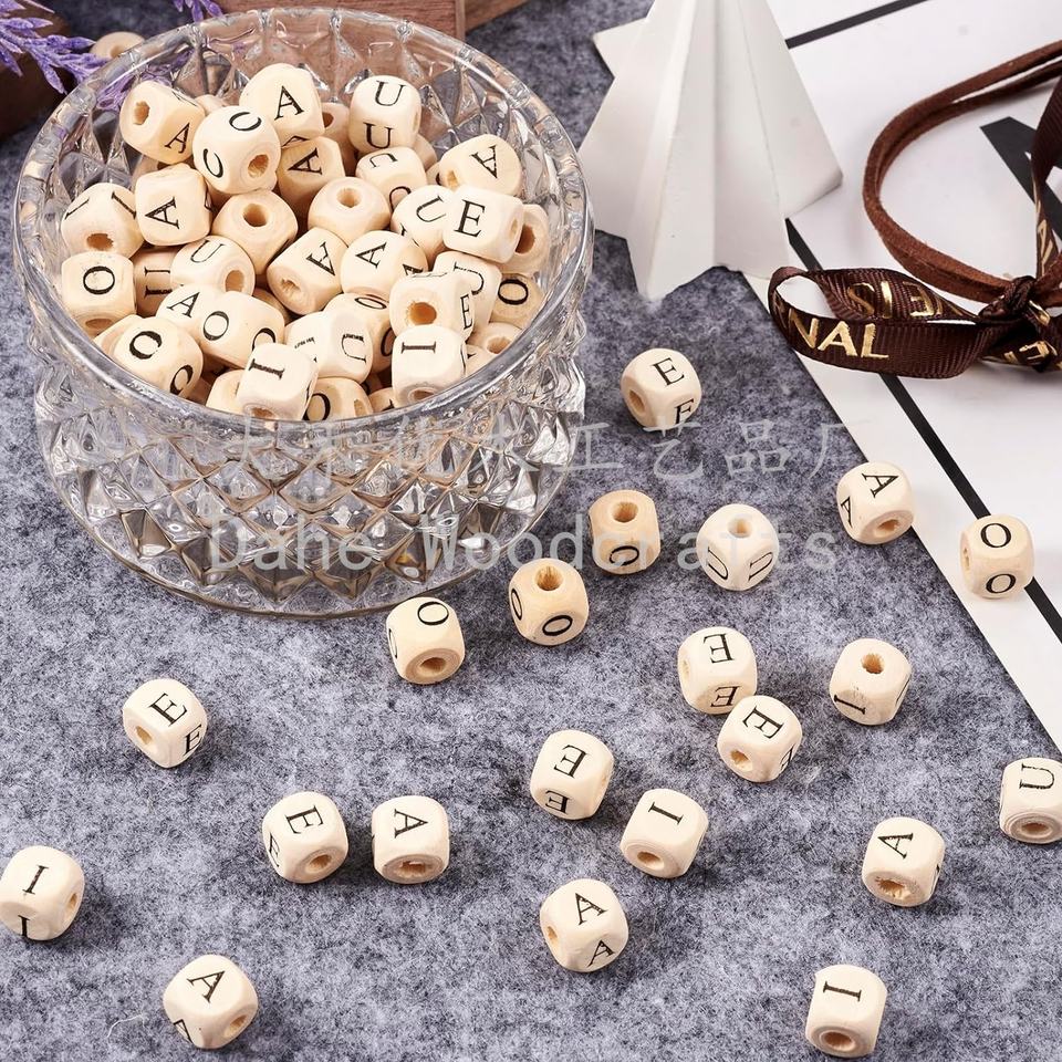 ลูกปัดไม้คิวบ์ขนาด10มม. จากโรงงานลูกปัดตัวอักษรสระไม้สำหรับงานฝีมือ DIY สร้อยข้อมือทำสร้อยคอ