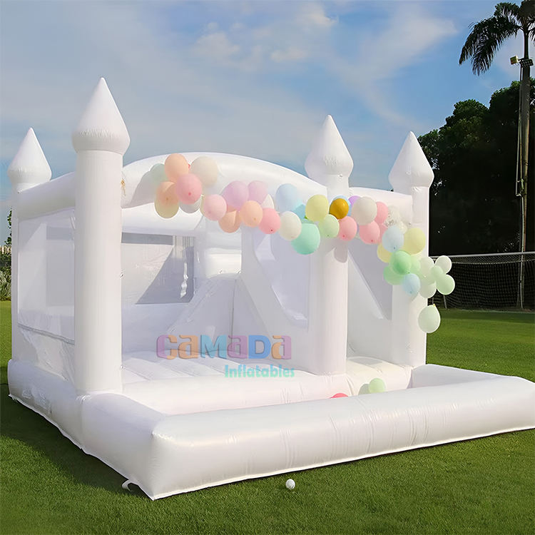 ปราสาทเด้งสีขาวเพื่อการพาณิชย์พร้อมสไลเดอร์และบอลสระว่ายน้ำบ้านเด้งเป่าลมกลางแจ้ง