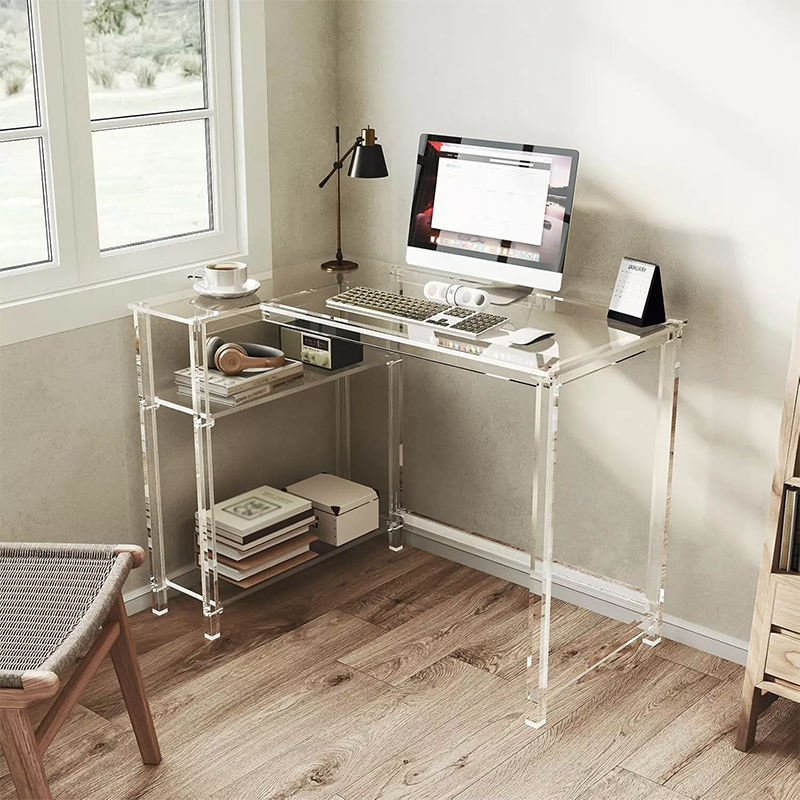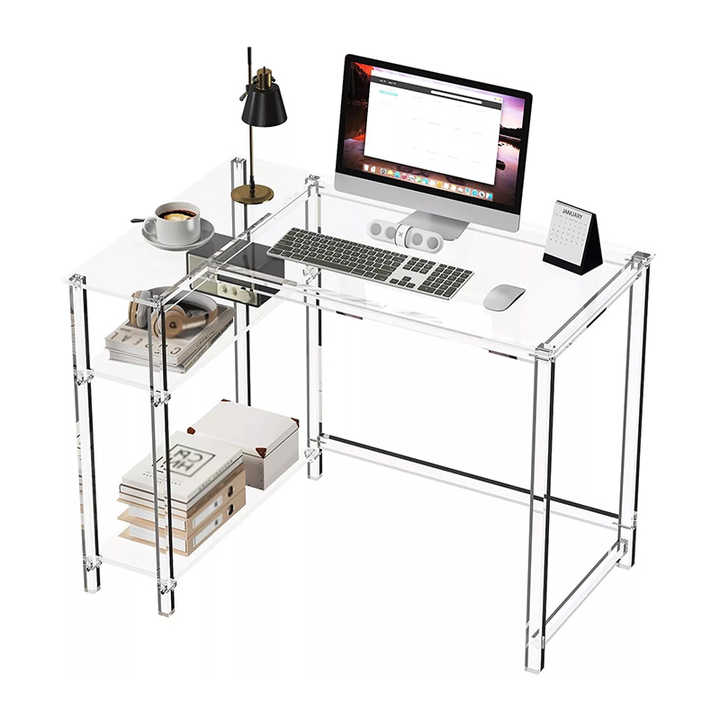 Factory Custom Acrylic L-Shaped Table Transparent Table with Reversible Storage Shelf