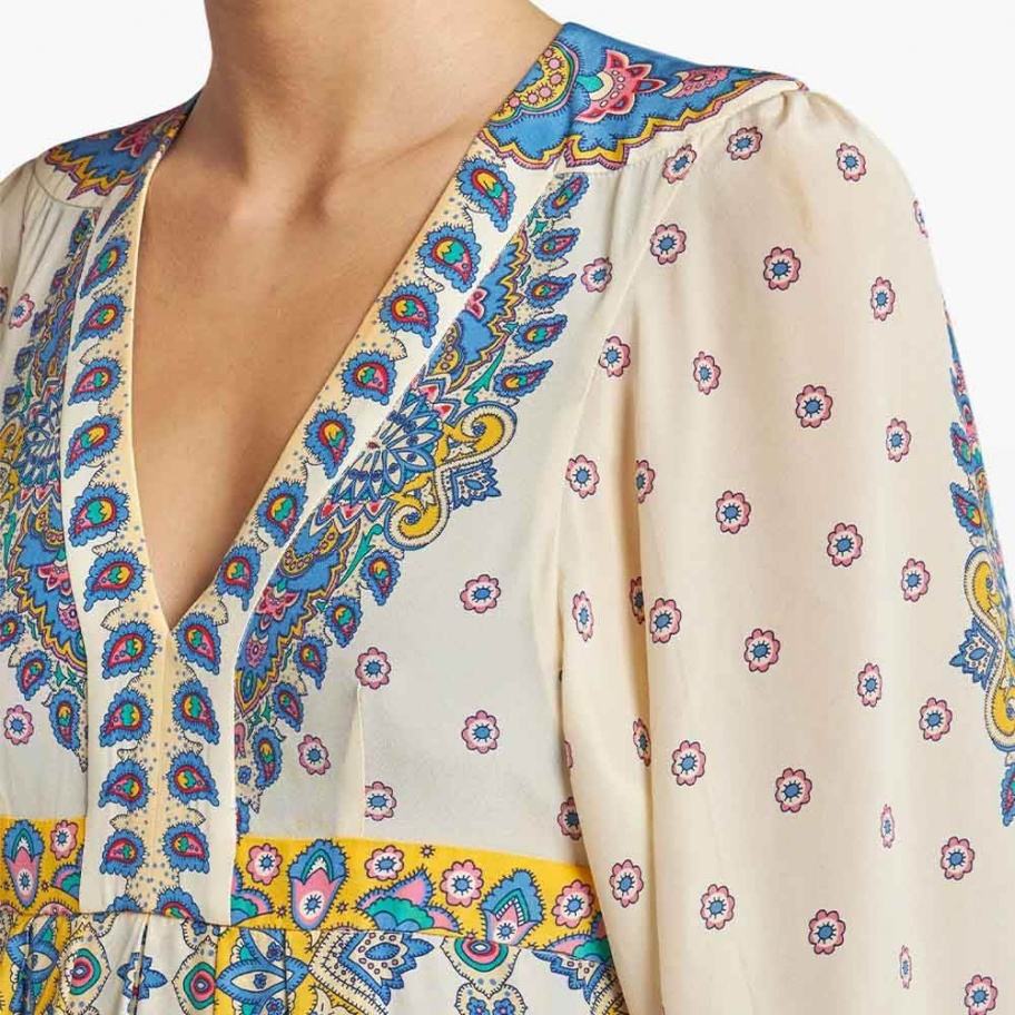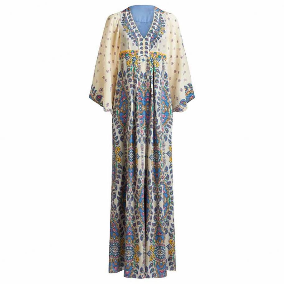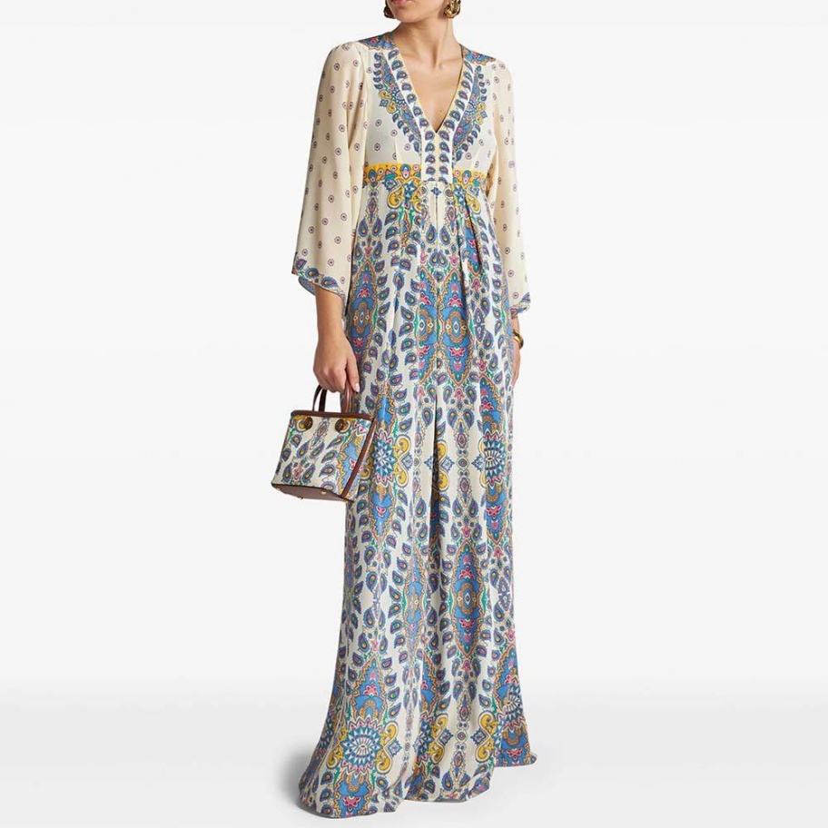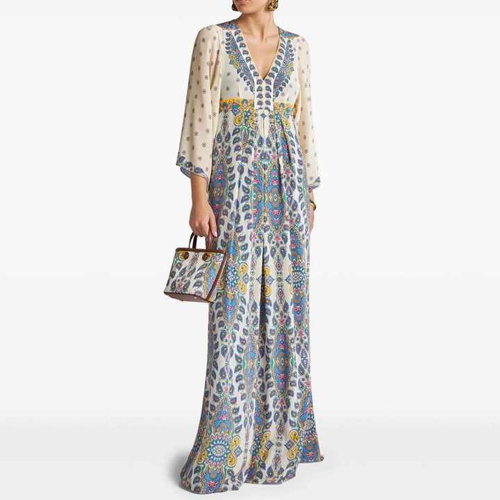 เดรสยาวพิมพ์ลายวินเทจสุดหรูสั่งทำจากโรงงาน แฟชั่นใหม่ คอวี แขนยาวทรงกว้าง สไตล์ลำลอง ผ้าวอร์สเตดธรรมชาติ