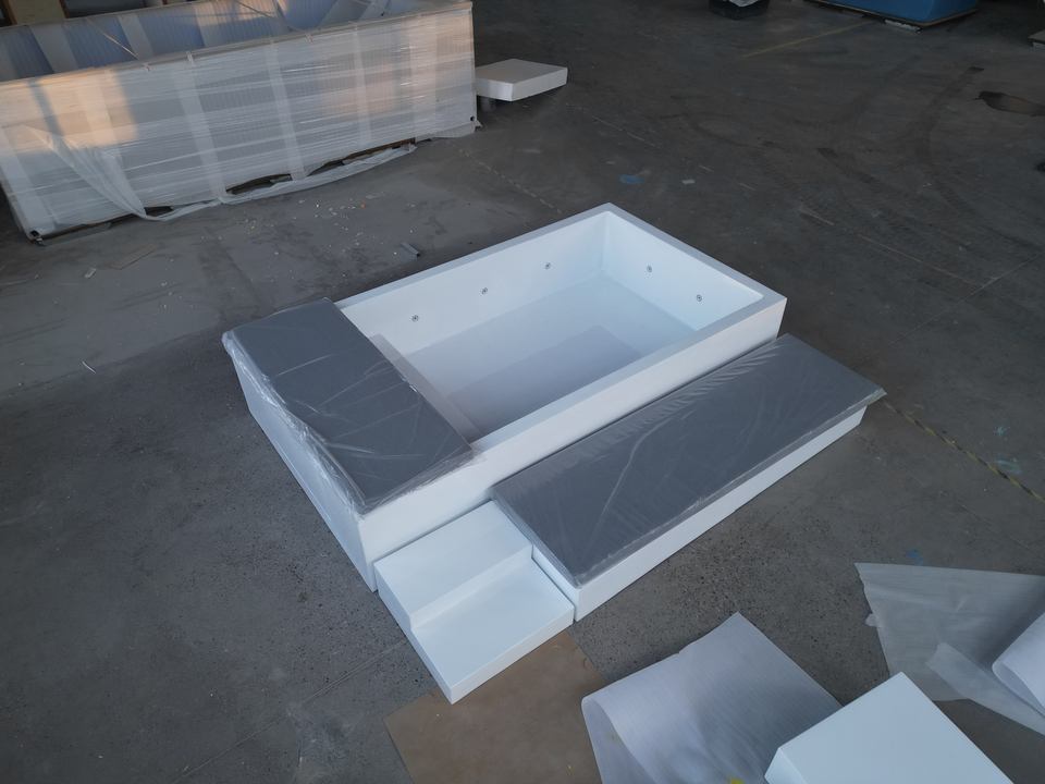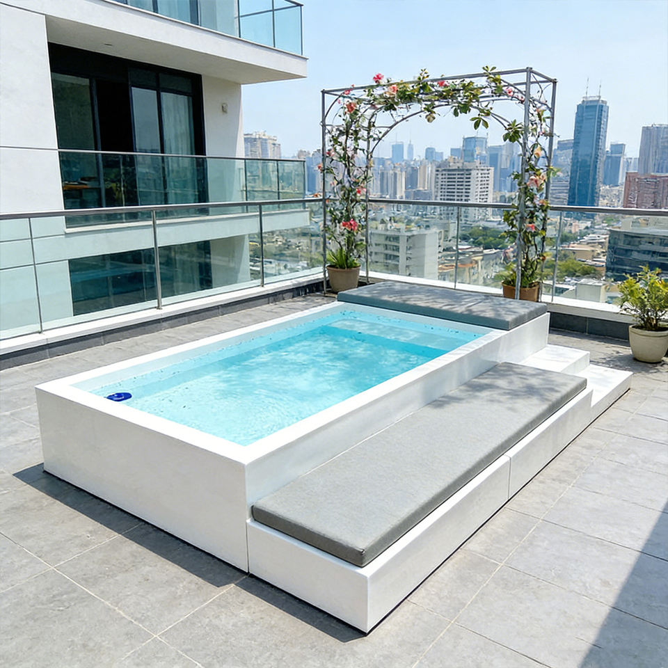 สระว่ายน้ำไฟเบอร์กลาสแบบสั่งทำจากโรงงาน ติดตั้งเหนือพื้นดิน พร้อมที่นั่งสำหรับวิลล่า ลานบ้าน ครอบครัว ติดตั้งง่าย สั่งซื้อจำนวนมากได้