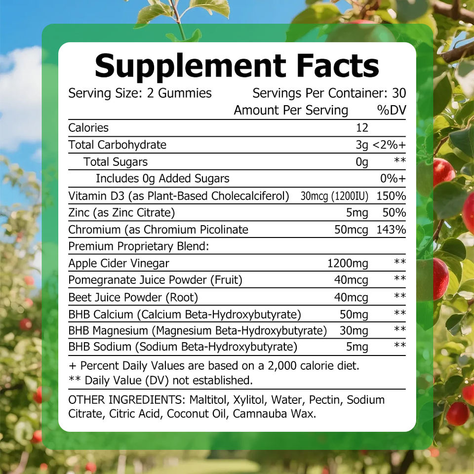 ส่วนผสมหลัก:คอมเพล็กซ์น้ำส้มสายชูหมักจากแอปเปิล, วิตามินดี 3, โครเมียม, ผงน้ำบีทรูท, สังกะสี