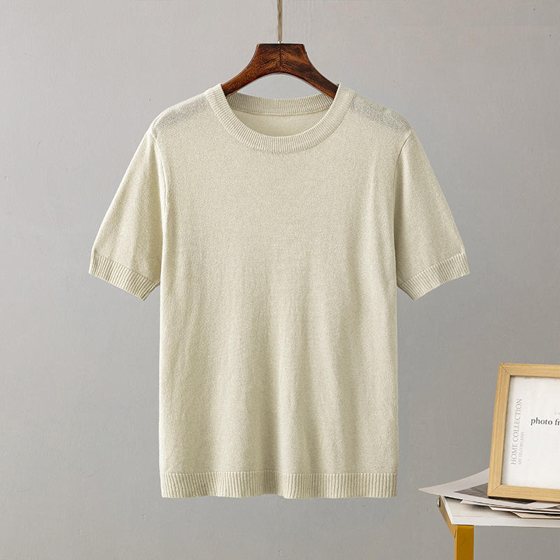 เสื้อยืดถักสั่งทำจากโรงงาน เสื้อถักแขนสั้นคอกลมสำหรับผู้หญิง คุณภาพสูง เสื้อถักลำลองพื้นฐานสำหรับฤดูร้อน