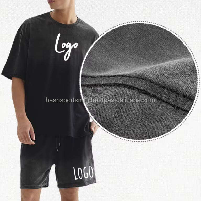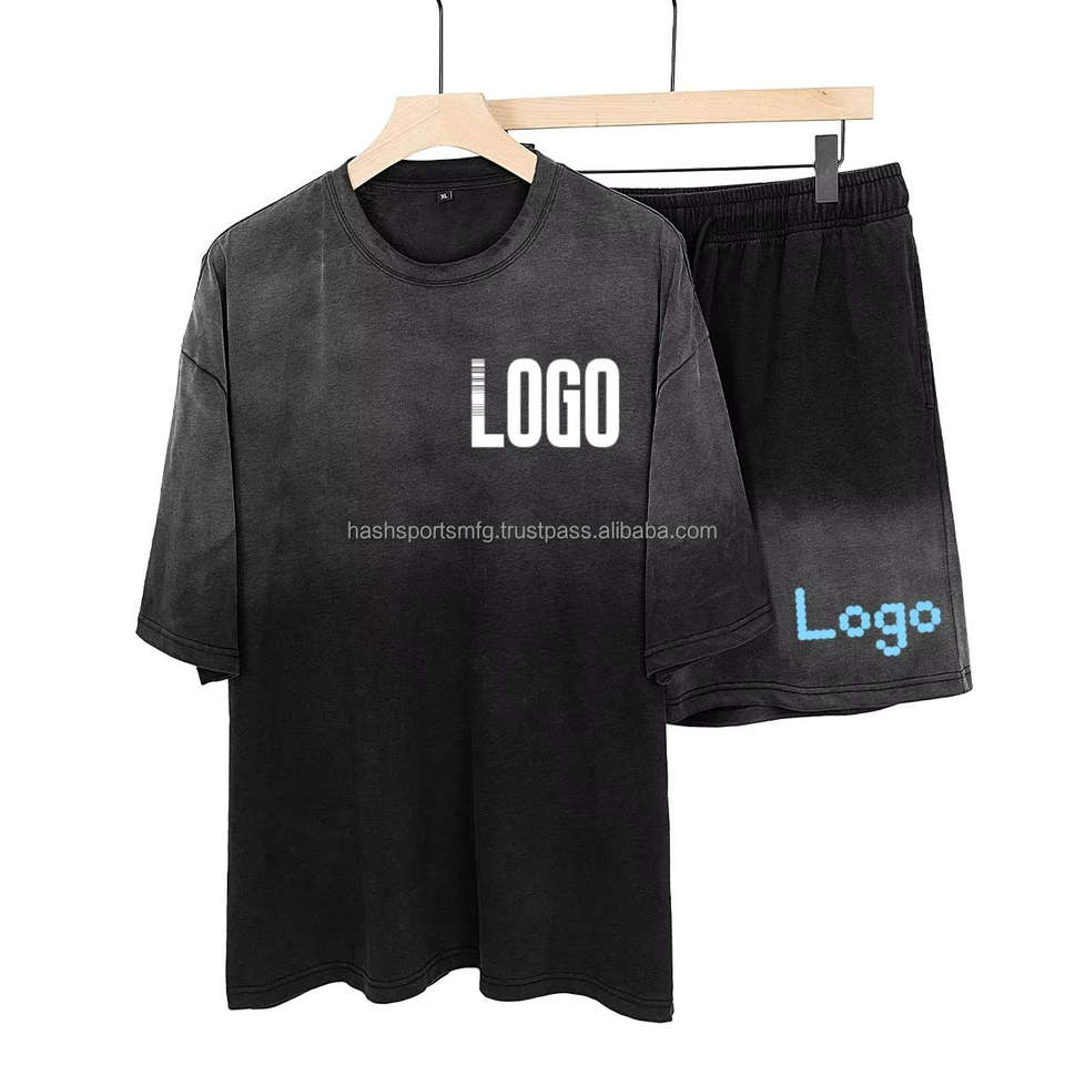 Factory Custom Men Summer T Shirt Set Graphic Logo Design 100% Cotton Acid Wash Men T Shirt and Shorts Set