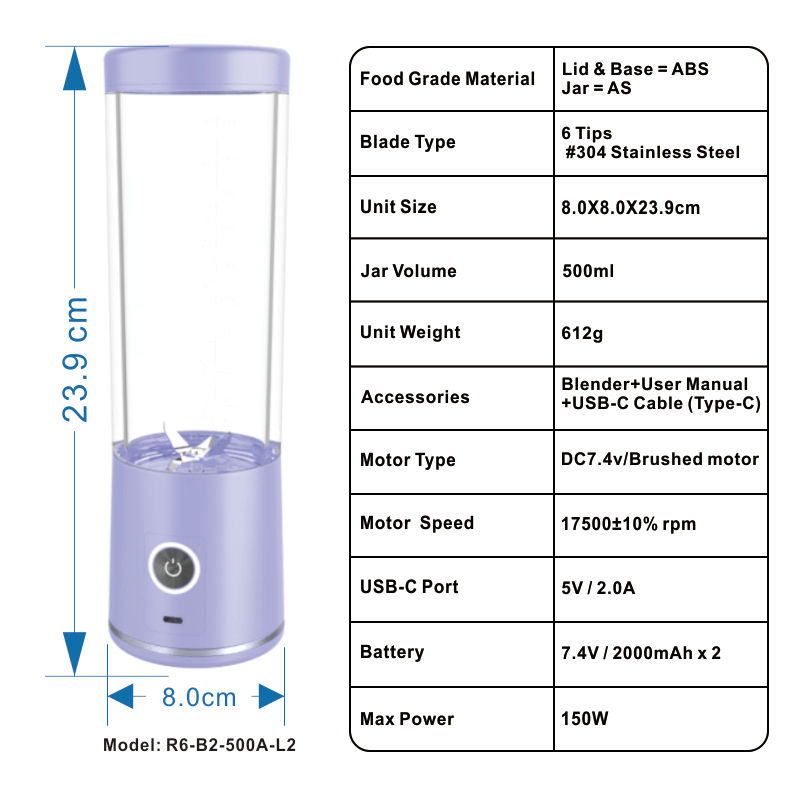 เครื่องปั่นน้ำผลไม้ไฟฟ้า USB ขนาดเล็กแบบพกพาไร้สายขนาด500มล. เครื่องปั่นน้ำผลไม้กลางแจ้งพร้อมแหล่งแบตเตอรี่
