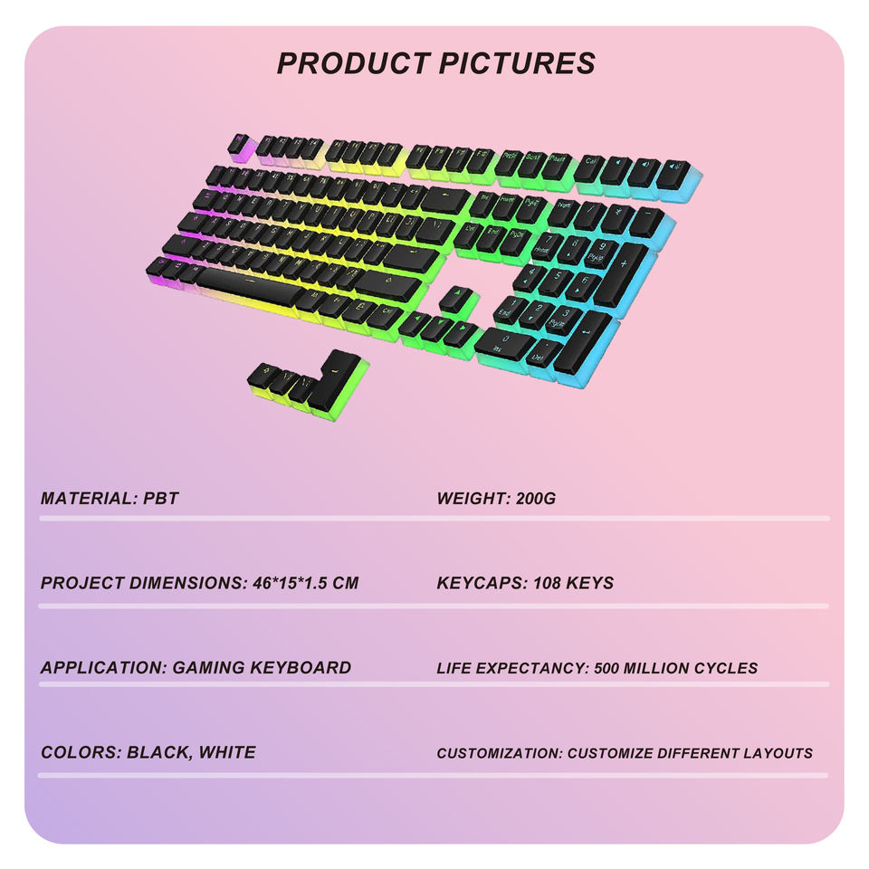 คีย์แคปแบบพุดดิ้งเรืองแสงด้านหลัง ผลิตตามสั่งจากโรงงาน วัสดุ PBT พิมพ์ลายด้านบน โปรไฟล์ OEM ชุดคีย์แคป 108 ปุ่ม แบบ Double Shot รองรับ Cherry MX