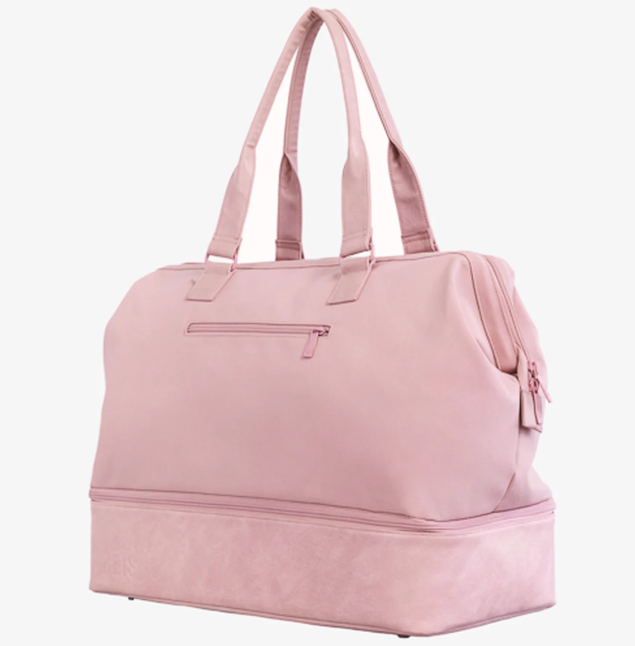 กระเป๋าทรงดัฟเฟิลดีไซน์เนอร์สปินเนอร์สำหรับผู้หญิงเลเซอร์โลโก้ตามสั่งสำหรับวัสดุพีซีสีชมพูสำหรับกระเป๋าเดินทางสุดสัปดาห์กลางแจ้ง