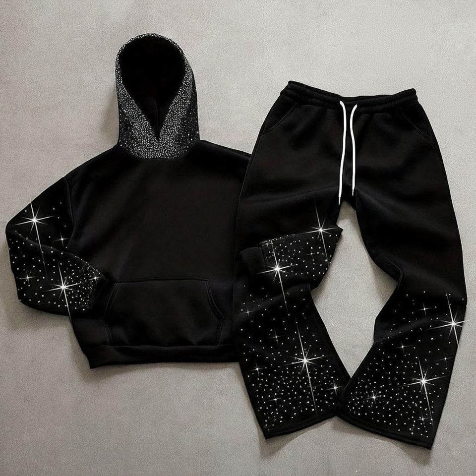 ชุดวอร์มผ้าฝ้ายปักคริสตัลสั่งทำจากโรงงาน – ชุดสตรีทแวร์หนาพร้อมฮู้ดมีกระเป๋าและกางเกงขายาวทรงบาน พิมพ์ลาย DTG สำหรับผู้ชาย