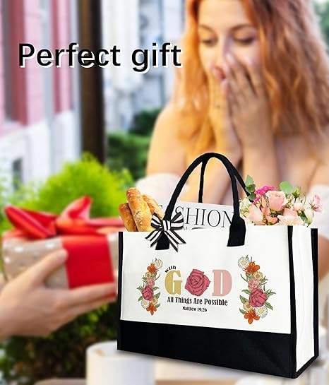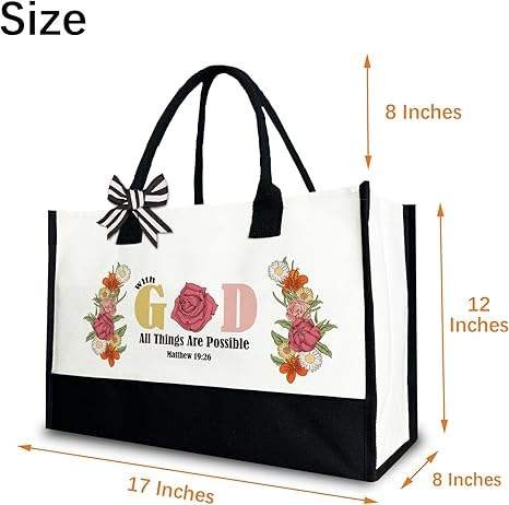 กระเป๋าโท้ทผ้าแคนวาสลายข้อความจากพระคัมภีร์ ดีไซน์คริสเตียน สำหรับผู้หญิง ผลิตตามสั่งจากโรงงาน พร้อมข้อความพระคัมภีร์ ด้วยพระเจ้าทุกสิ่งเป็นไปได้