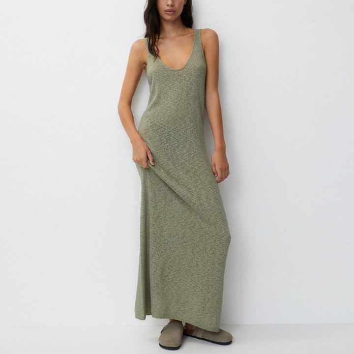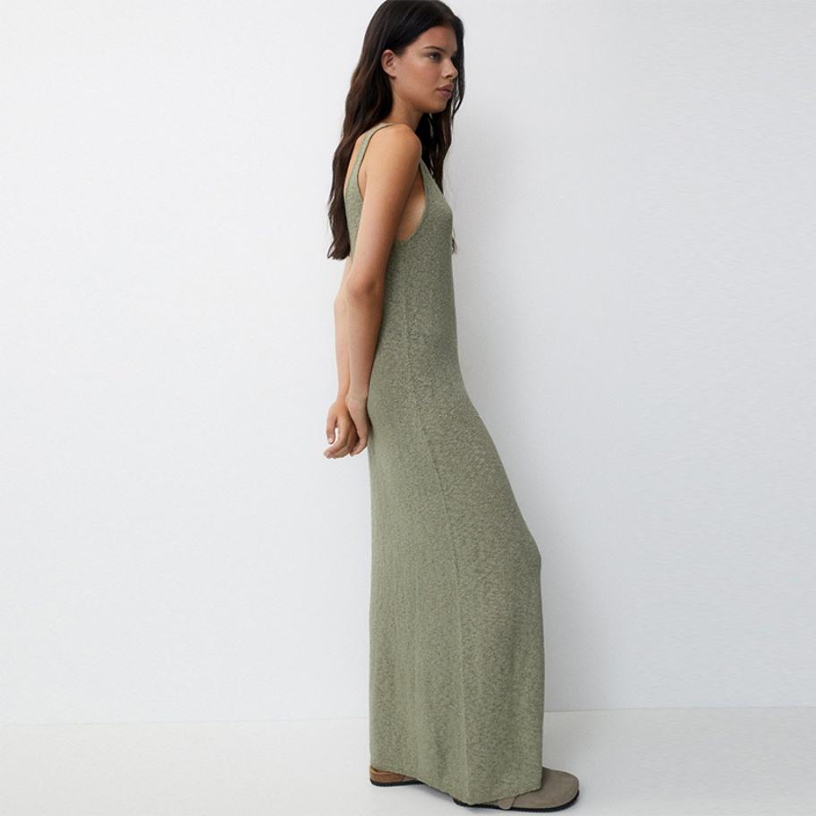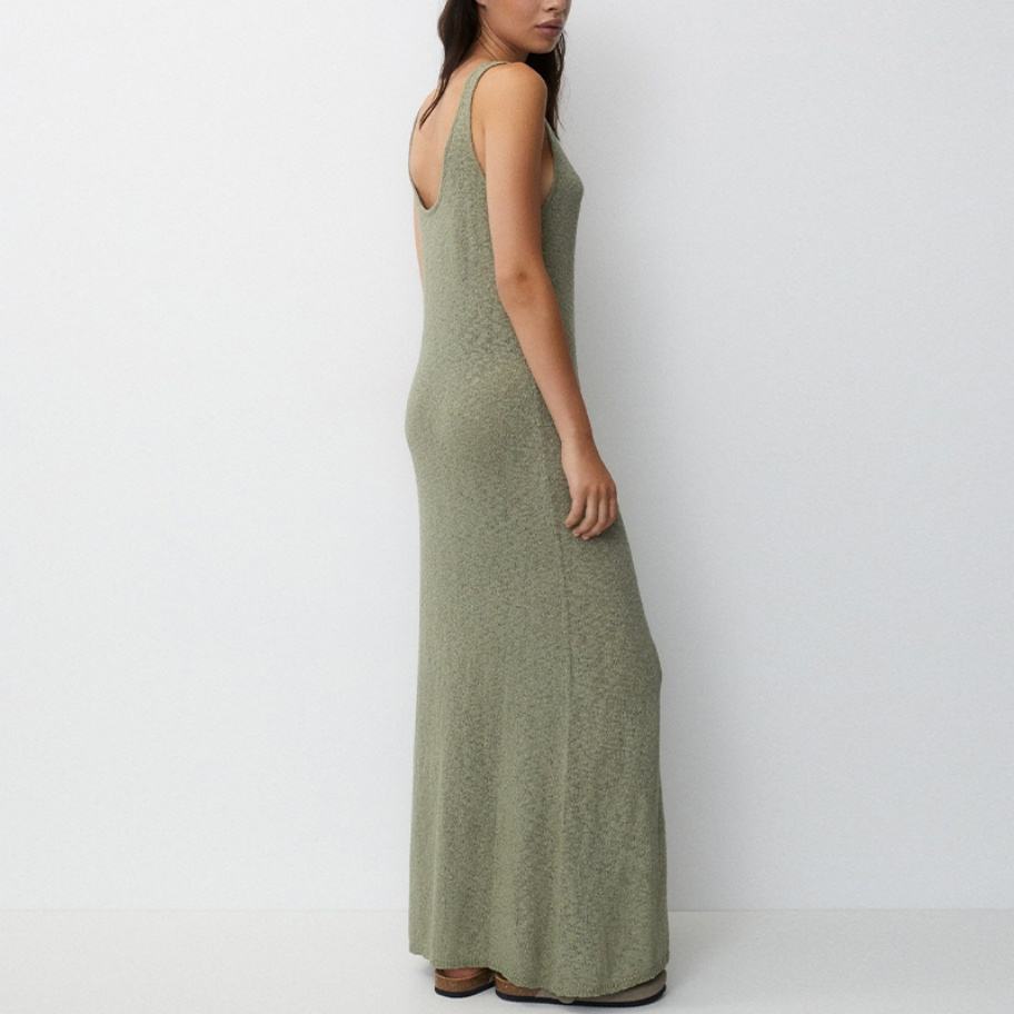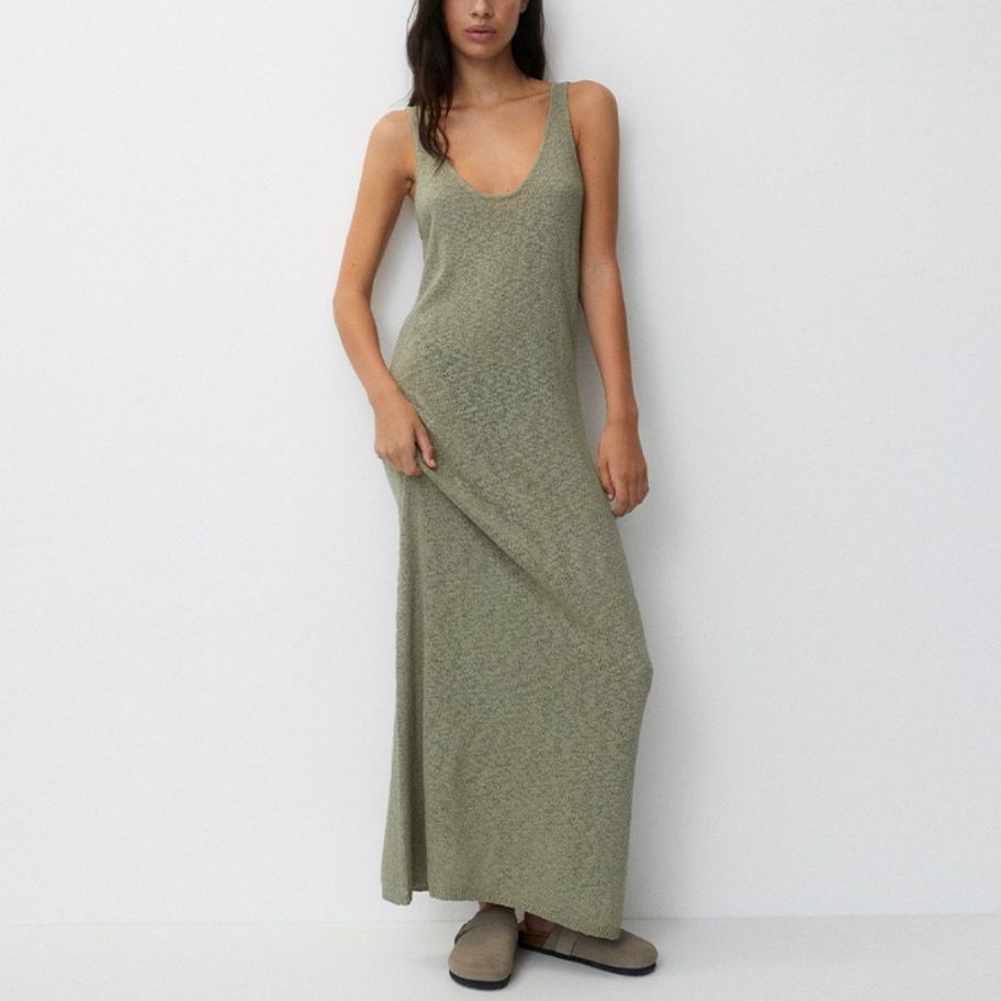 ชุดเดรสลำลองผู้หญิงแบบสั่งตัดจากโรงงาน แขนกุด คอวี ดีไซน์หรูหรา ผ้าถักลายเรียบ เอวธรรมชาติ ทรงตรง เหมาะสำหรับฤดูร้อน