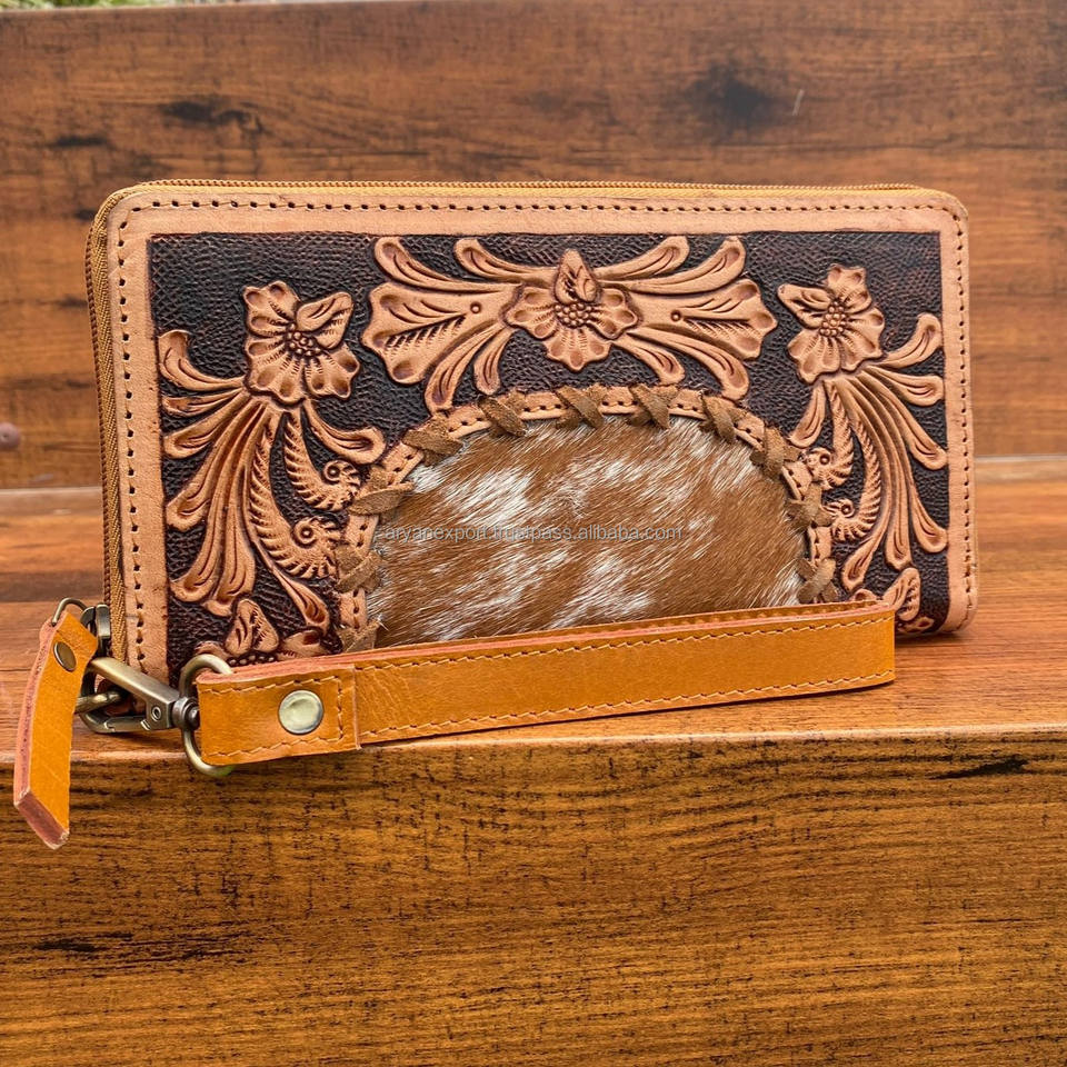 Hand Tooled Cowhide Leather Wristlet Zipper Wallet