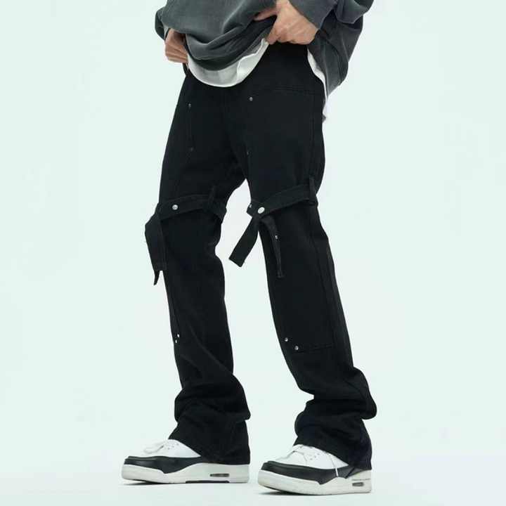 กางเกงยีนส์ทรงขากระดิ่งแบบสตรีทแฟชั่นสำหรับผู้ชาย แบบสั่งทำพิเศษจากโรงงาน ตกแต่งด้วยสายรัดและหมุด ทรงหลวม