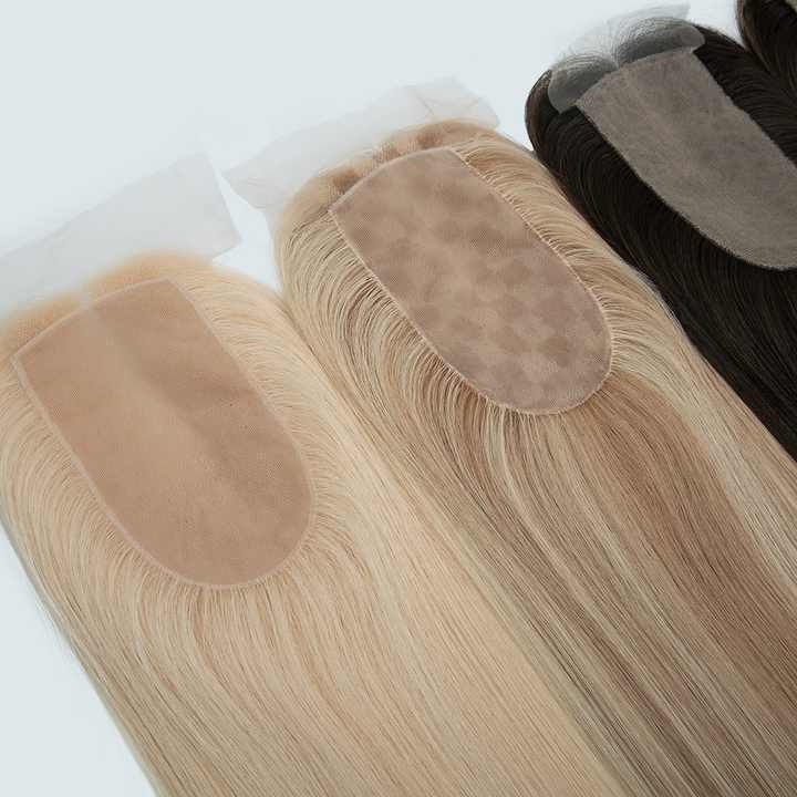 ท็อปเปอร์ผมแท้ยุโรปแบบสั่งทำจากโรงงาน ขนาด 3x6 นิ้ว ฐานลูกไม้ HD และฐานผ้าไหม ความหนาแน่น 150% ปมผมฟอกสี สำหรับผมบาง