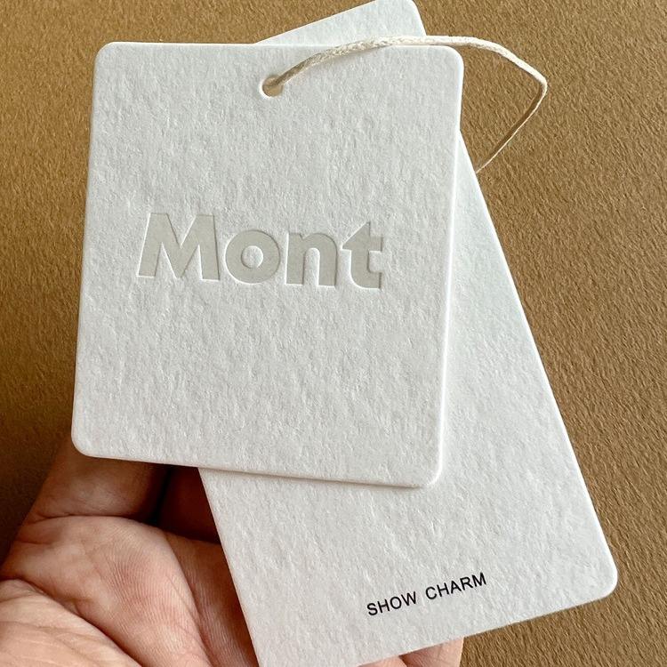 ป้ายแขวนแบบนูนลายหรูหราเป็นมิตรกับสิ่งแวดล้อม ผลิตตามสั่งจากโรงงาน ทำจากกระดาษเนื้อฝ้าย 700 กรัม สำหรับกระเป๋า รองเท้า และเสื้อผ้า