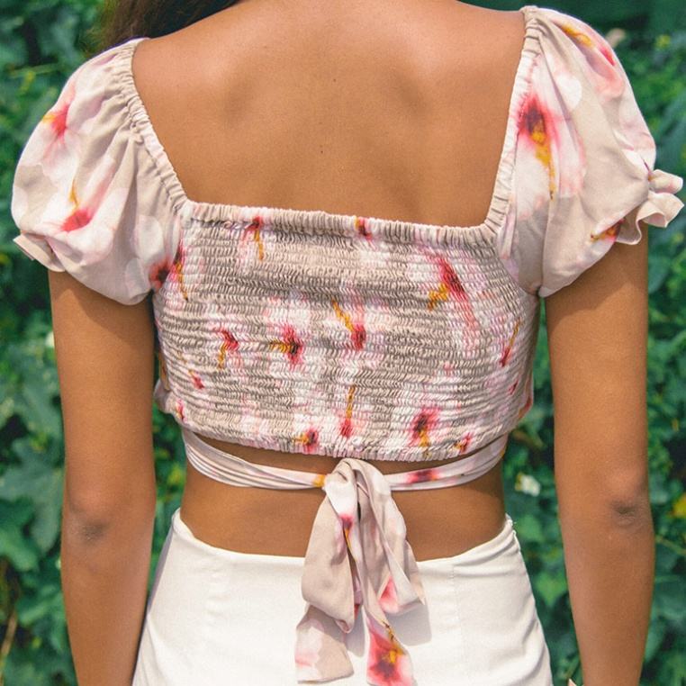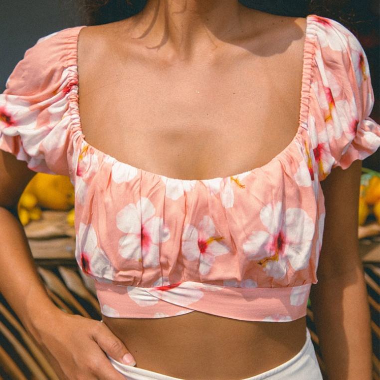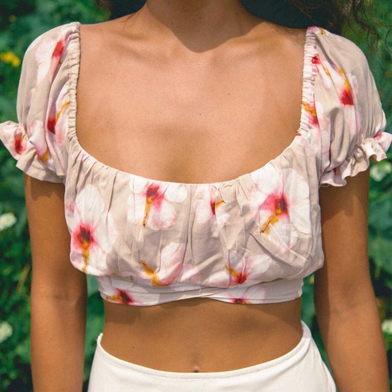 เสื้อครอปพิมพ์ลายชายหาด ดีไซน์โรงงาน แขนพอง จับจีบ ผลิตตามสั่ง ผ้าเรยอน 100% เนื้อผ้านุ่ม