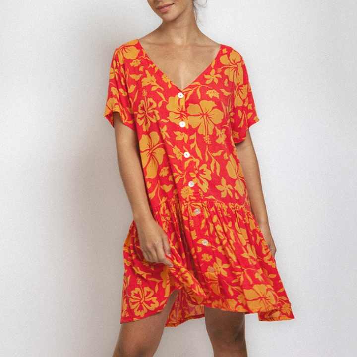ชุดเดรสลายดอกไม้สไตล์โบฮีเมียน ดีไซน์โรงงาน คอวีติดกระดุม ชุดลำลอง ผ้าลินินผสมคอตตอนคุณภาพสูง ความยาวระดับเข่า