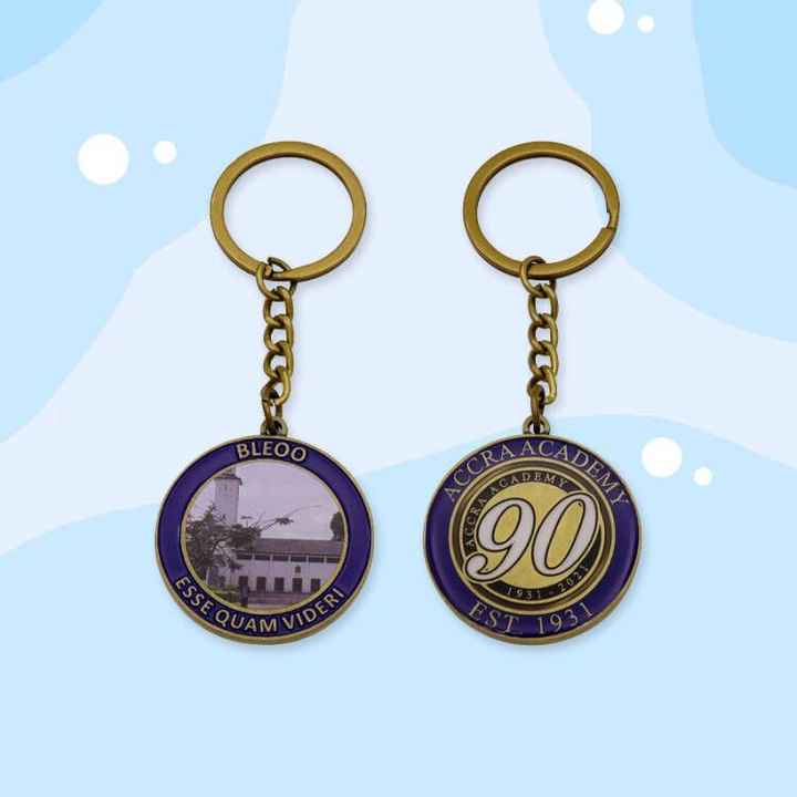พวงกุญแจโลหะแบบกำหนดเอง ผลิตด้วยวิธีหล่อขึ้นรูป พร้อมที่ใส่โลโก้ทรงกลม ตัวเลือกการพิมพ์แบบออฟเซ็ตและยูวี