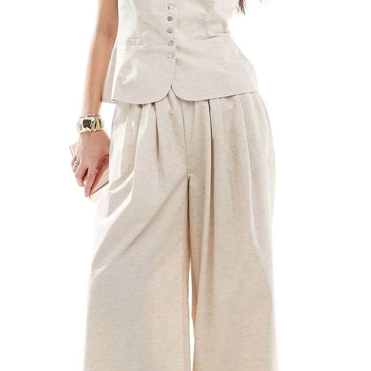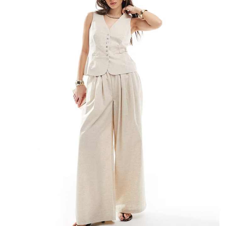 ชุดเซ็ตสองชิ้นผ้าลินินเนื้อนุ่ม 100% ออกแบบโดยโรงงาน คุณภาพสูง สำหรับผู้หญิง ชุดกางเกงขายาวทรงหลวมสไตล์ชายหาด เสื้อแขนกุดเข้ารูป สั่งทำได้