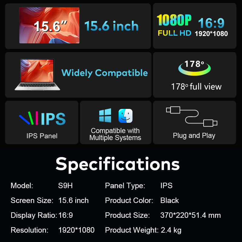จอภาพพกพาแบบสามจอขนาด 15.6 นิ้ว รุ่น S9H จากโรงงานโดยตรง ความละเอียด Full HD 1080P พร้อมจอแสดงผล IPS มุมมองกว้าง