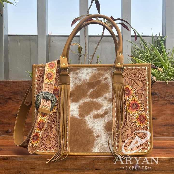 Hand Tooled Sunflower Cowhide Fringe Tote Bag